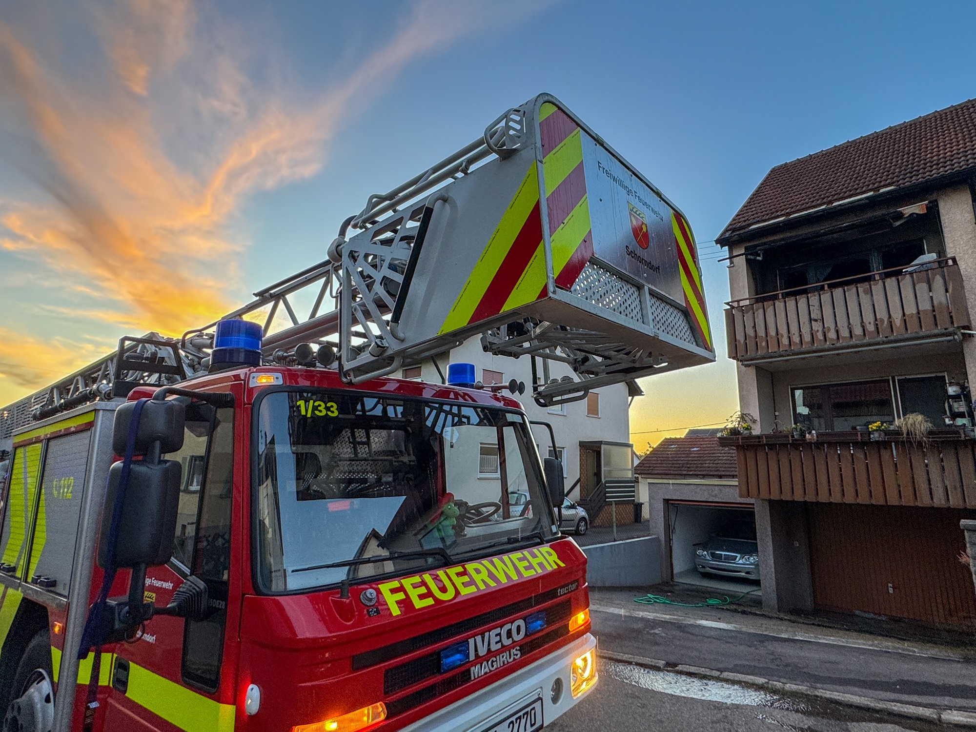 Die Freiwillige Feuerwehr Schorndorf wurde am Dienstagabend zu einem Brand auf einem Balkon alarmiert. Das Feuer konnte rasch mit zwei C-Rohren gelöscht werden. Anschließend wurden umfassende Nachlöscharbeiten durchgeführt, unter anderem das Aufdecken des Daches mit der Drehleiter. Außerdem wurde die Wohnung durch die Feuerwehr belüftet.