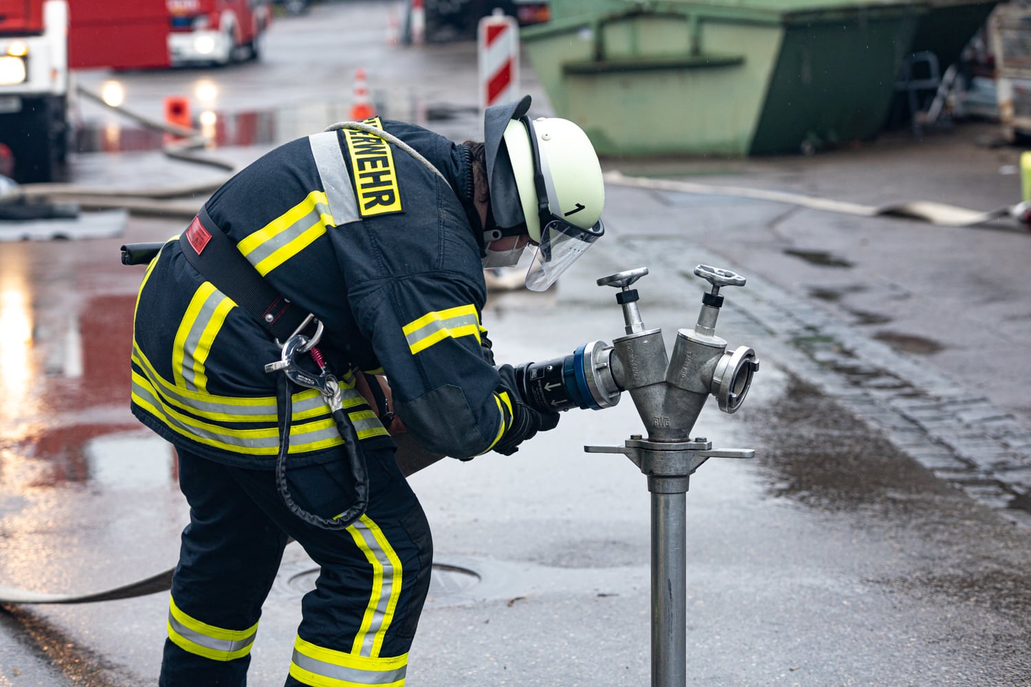 In einer großen Abschlussübung konnten die Nachwuchsfeuerwehrleute ihr Können zahlreichen Zuschauern, darunter viele Familienangehörige, präsentieren. Bei der Übung auf dem Baubetriebshof der Zentralen Dienste wurde angenommen, dass ein Fahrer beim Abbiegen in eine Seitenstraße die Kontrolle über sein Fahrzeug verlor und in einen Hauseingang fuhr. Durch den Aufprall fing das Fahrzeug im Motorraum Feuer, der Brand drohte auf das Gebäude überzugreifen.