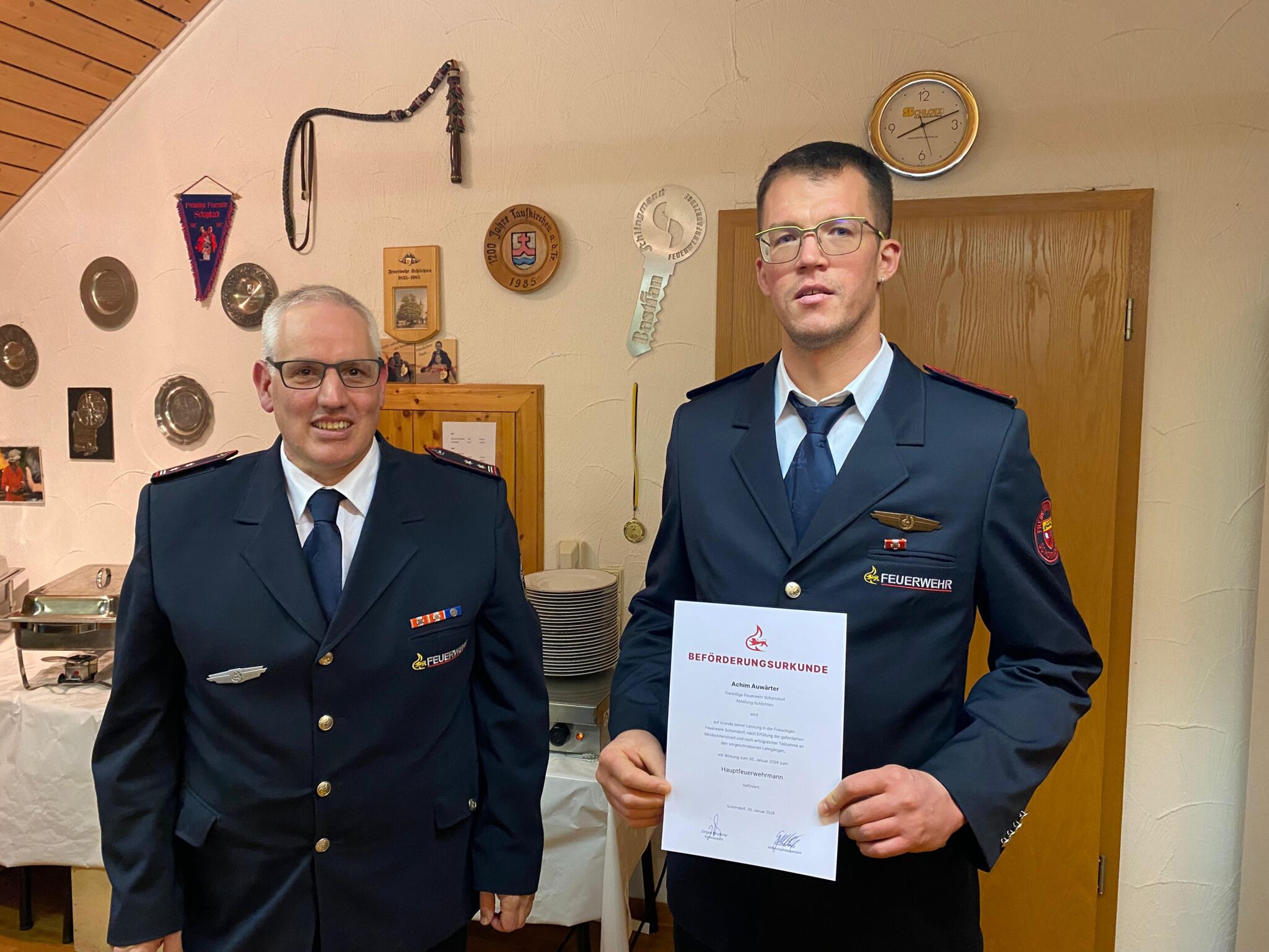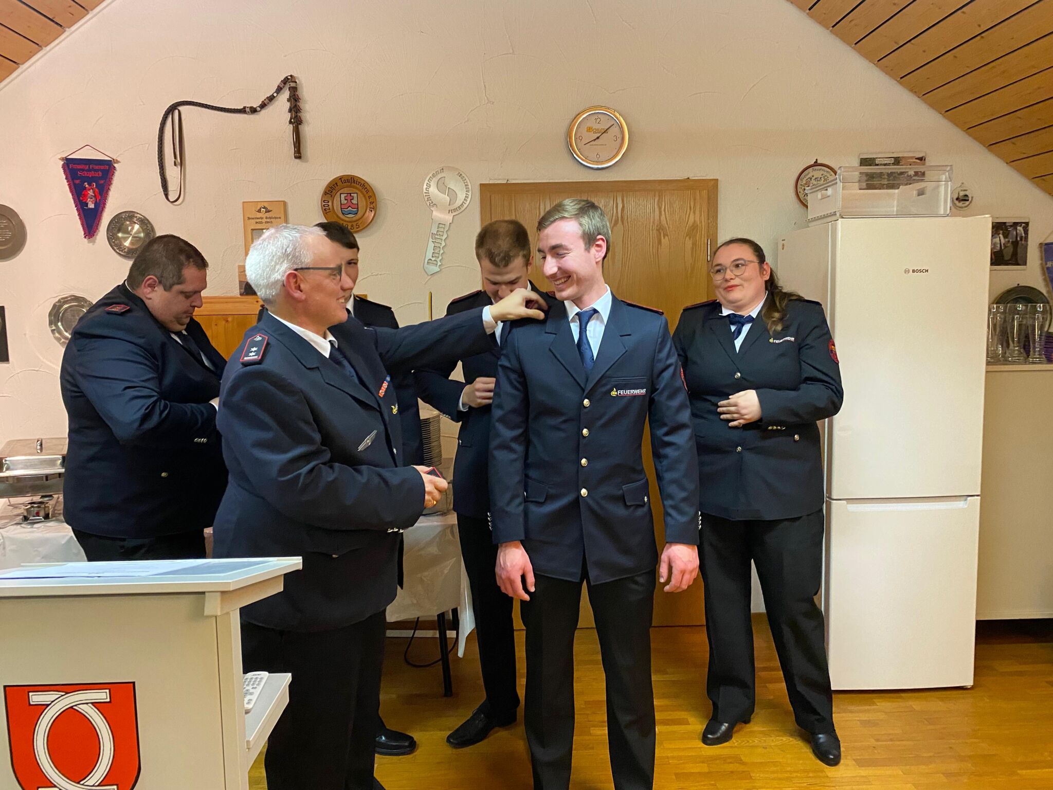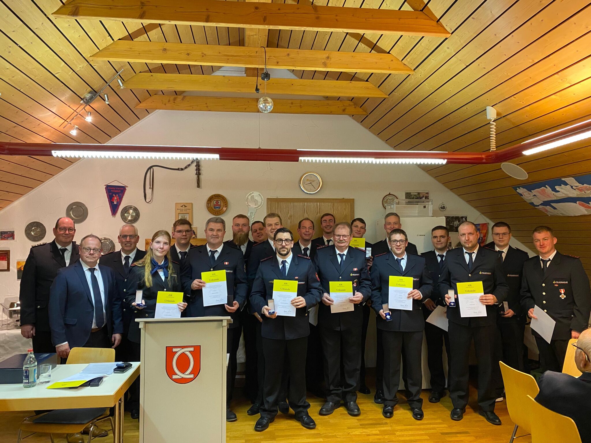 Im Rahmen der Hauptversammlung wurden zudem verschiedene Ehrungen und Beförderungen durchgeführt. Nach diversen Lehrgängen und der Mindestdienstzeit wurden Andrea Junge, Kevin Wild, Jens Pfeil und Luca Kohlbeck zum Oberfeuerwehrmann und Achim Auwärter zum Hauptfeuerwehrmann befördert. Nach Absolvierung einer 15-jährigen Dienstzeit erhielt Christian Wild das Feuerwehr-Ehrenzeichen in Bronze.