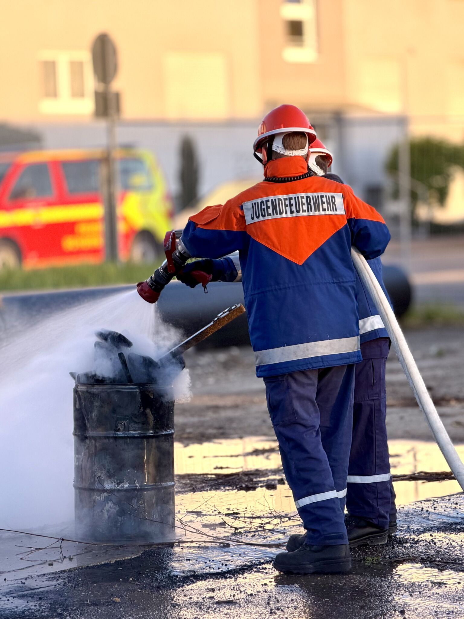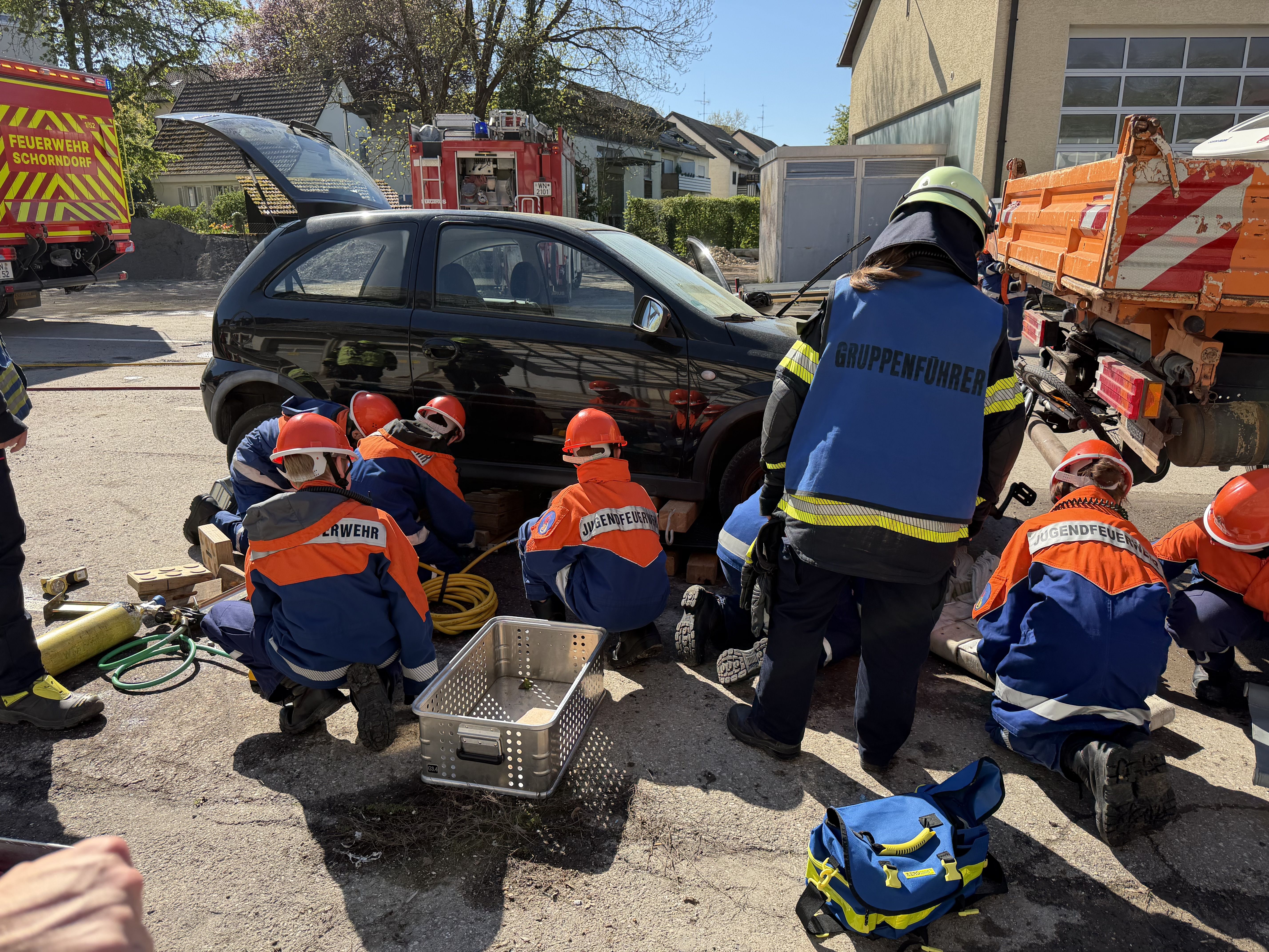 Am Ende des 24h Dienstens gegen 16:00Uhr der Abschlusseinsatz. Diese war noch einmal besonders aufregend, da mehrere Elemente kombiniert wurden. Es gab ein Auffahrunfall eines PKW auf einen LKW, eine eingesperrte leicht verletzte Person in einem Auto sowie eine weitere Person, die unter dem PKW lag, dessen Fahrrad zwischen den Fahrzeugen klemmte und bei den Fahrzeugen eine Rauchentwicklung deutlich erkennbar war. Hier mussten wir unser gesamtes Wissen und Können nochmal voll einsetzen, um die Personen sicher zu retten. Die Übung zeigte, wie viel wir gelernt hatten, wie gut wir als Team zusammenarbeiten können. Obwohl einige Familien zum Zuschauen anwesend waren, arbeiteten wir konzentriert und zügig.