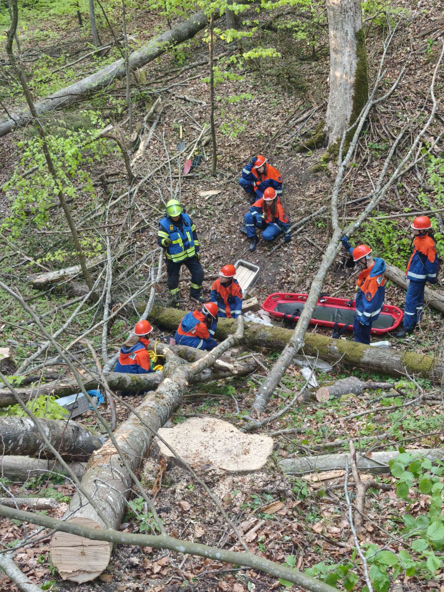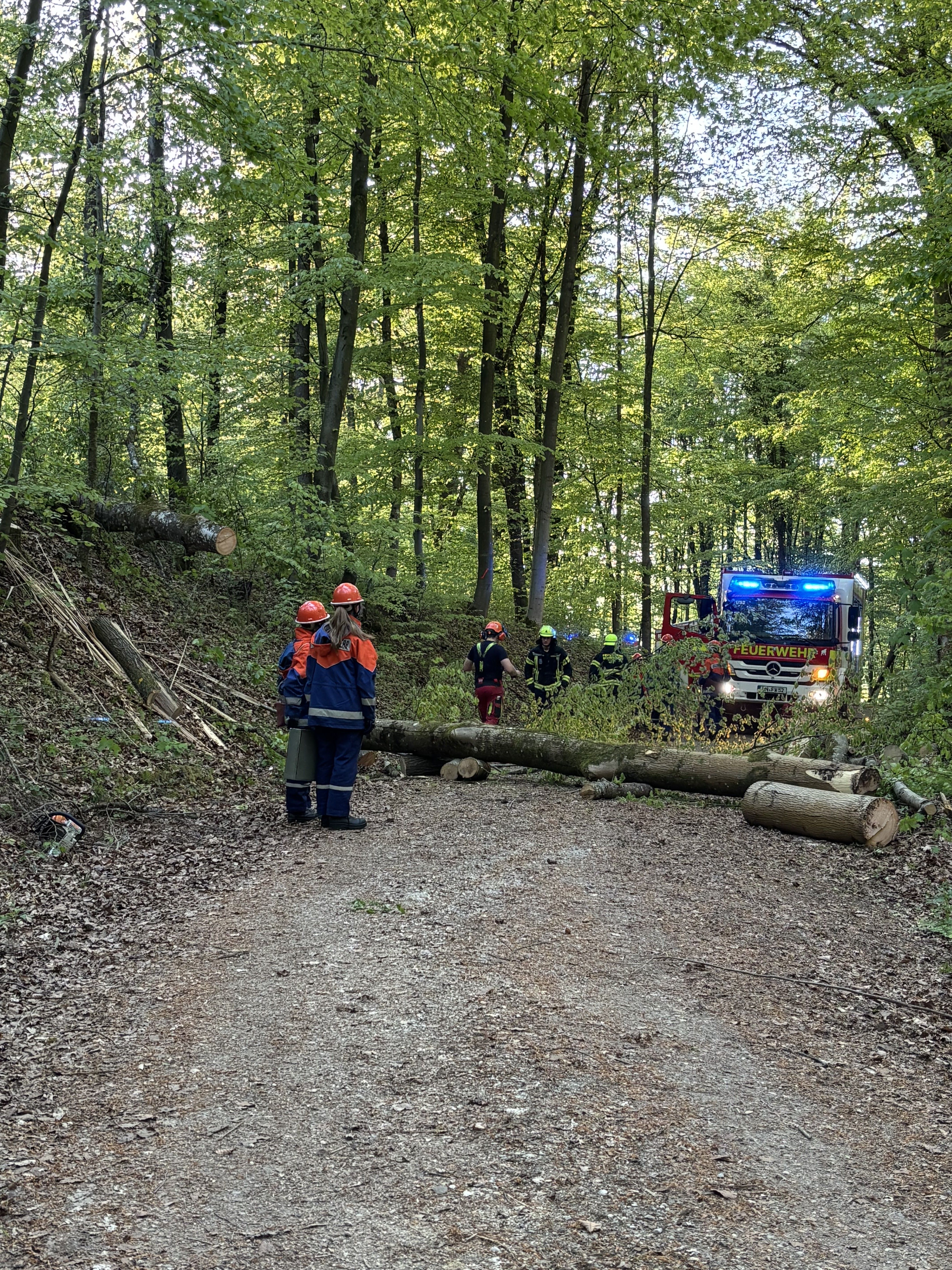 Im Anschluss daran wurden uns die wichtigsten Abläufe, Regeln und unser Alarmierungssystem erklärt. Wir wurden auf die jeweiligen Einsatzfahrzeuge und Positionen eingeteilt. Danach ging es auch schon los, der erste von 8 Einsätzen für die Jugendfeuerwehr. Im Wald wurde ein Waldarbeiter unter einem Baum eingeklemmt, die Zufahrt zur Einsatzstelle war durch einen anderen Baum versperrt. Gemeinsam machten wir den Weg frei und befreiten den verletzten Arbeiter.