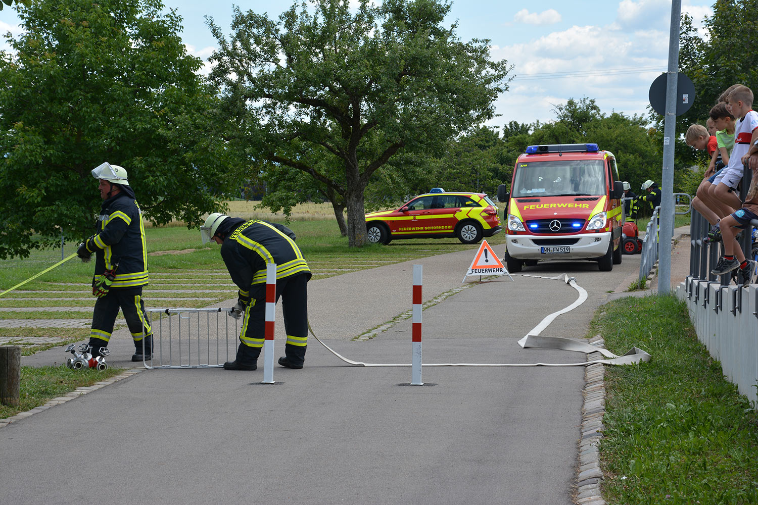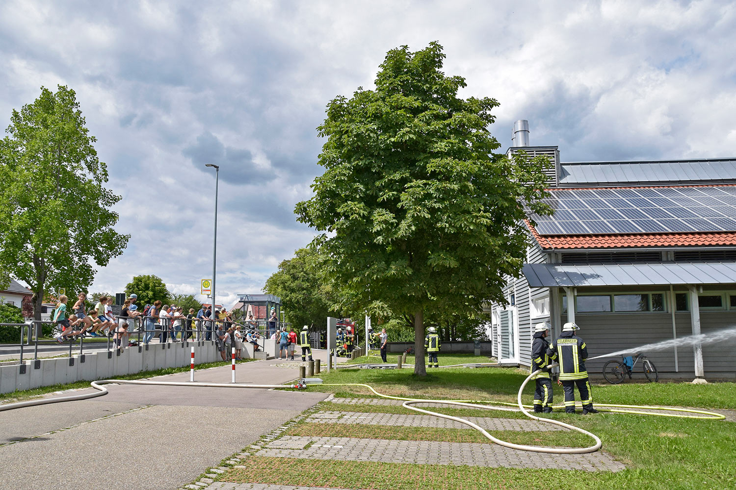Um das Übergreifen des Brandes auf weitere Gebäudeteile zu verhindern wurden parallel zur Menschenrettung auf beiden Gebäudenseiten vorsorglich Riegelstellungen eingerichtet. Nach Übergabe aller geretteten Jugendlichen an den Rettungsdienst wurde der ursächliche Schwelbrand im Bereich der Photovoltaik-Anlage abgelöscht und das verrauchte Gebäude anschließend belüftet.