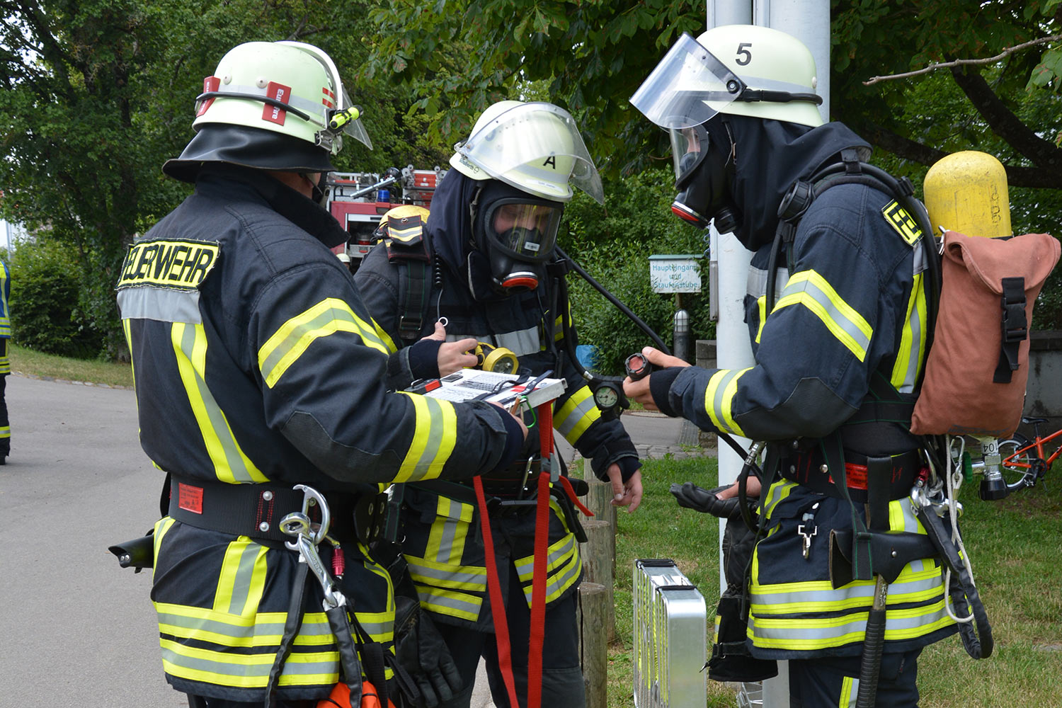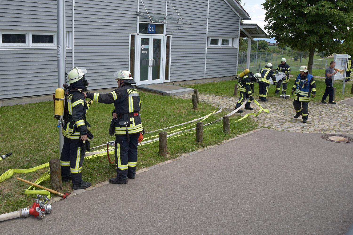 Nach dem Eintreffen der Einsatzkräfte an der Einsatzstelle wurde von der Wangener Straße her eine Wasserversorgung aufgebaut. Ein mit umluftunabhängigem Atemschutz ausgerüsteter Angriffstrupp konnte die drei vermissten Jugendlichen im Umkleidebereich der verrauchten Schurwaldhalle schnell auffinden, retten und an vor dem Gebäude bereitstehende Kameraden zur Betreuung übergeben.