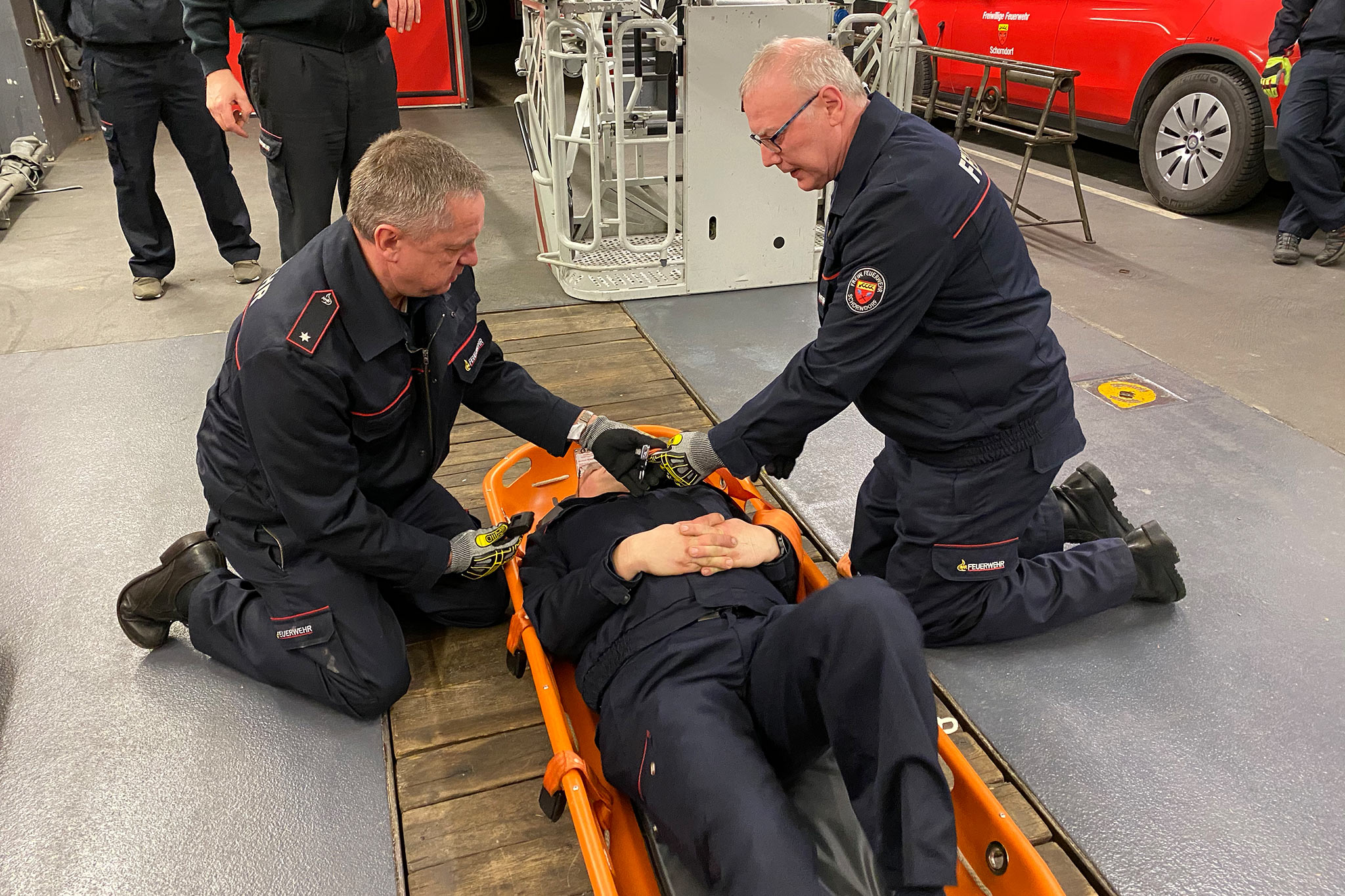 Außerdem wurde der Umgang mit der neuen Krankentragenlagerung der Drehleiter trainiert. Diese kommt meistens dann zum Einsatz, wenn Personen schonend aus oberen Stockwerken gerettet werden müssen und ein Transport durch das Treppenhaus nicht möglich ist. Elf mal war dies im vergangenen Jahr der Fall. Mit dem neu beschafften Modell kann nicht nur die Krankentrage des Rettungsdienstes, sondern auch die Schleifkorbtrage, sicher transportiert werden.
