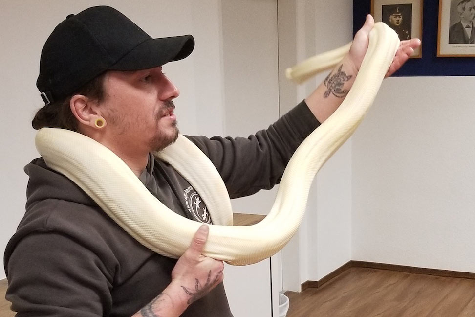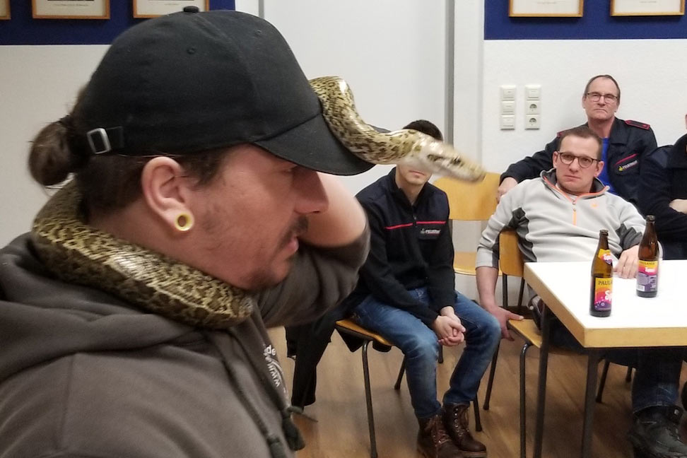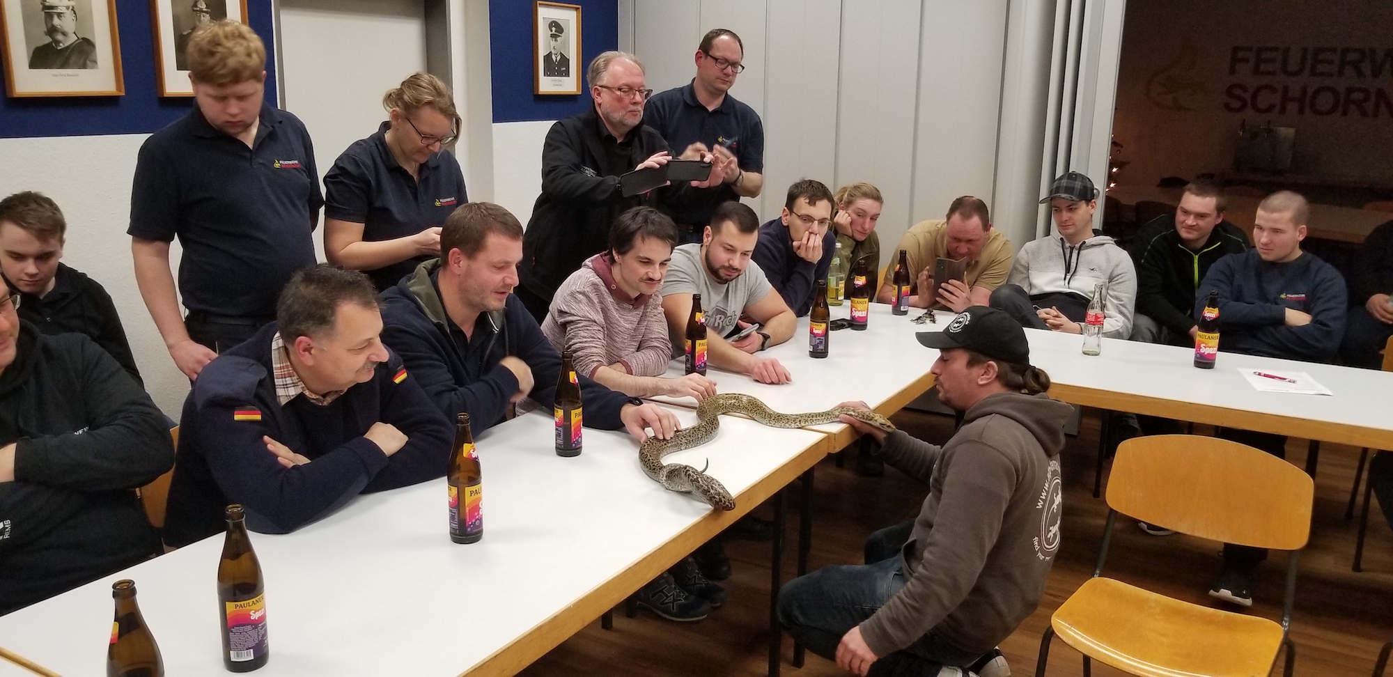 Ein Reptilienexperte hatte hierfür extra Schlangen, Spinnen, Skorpione und Bartagamen dabei. Er erklärte die Gefahren und die Gewohnheiten der Tiere. Zum Abschluss durfte jeder Feuerwehrangehörige ein Tier berühren, um die Angst ein wenig zu nehmen.