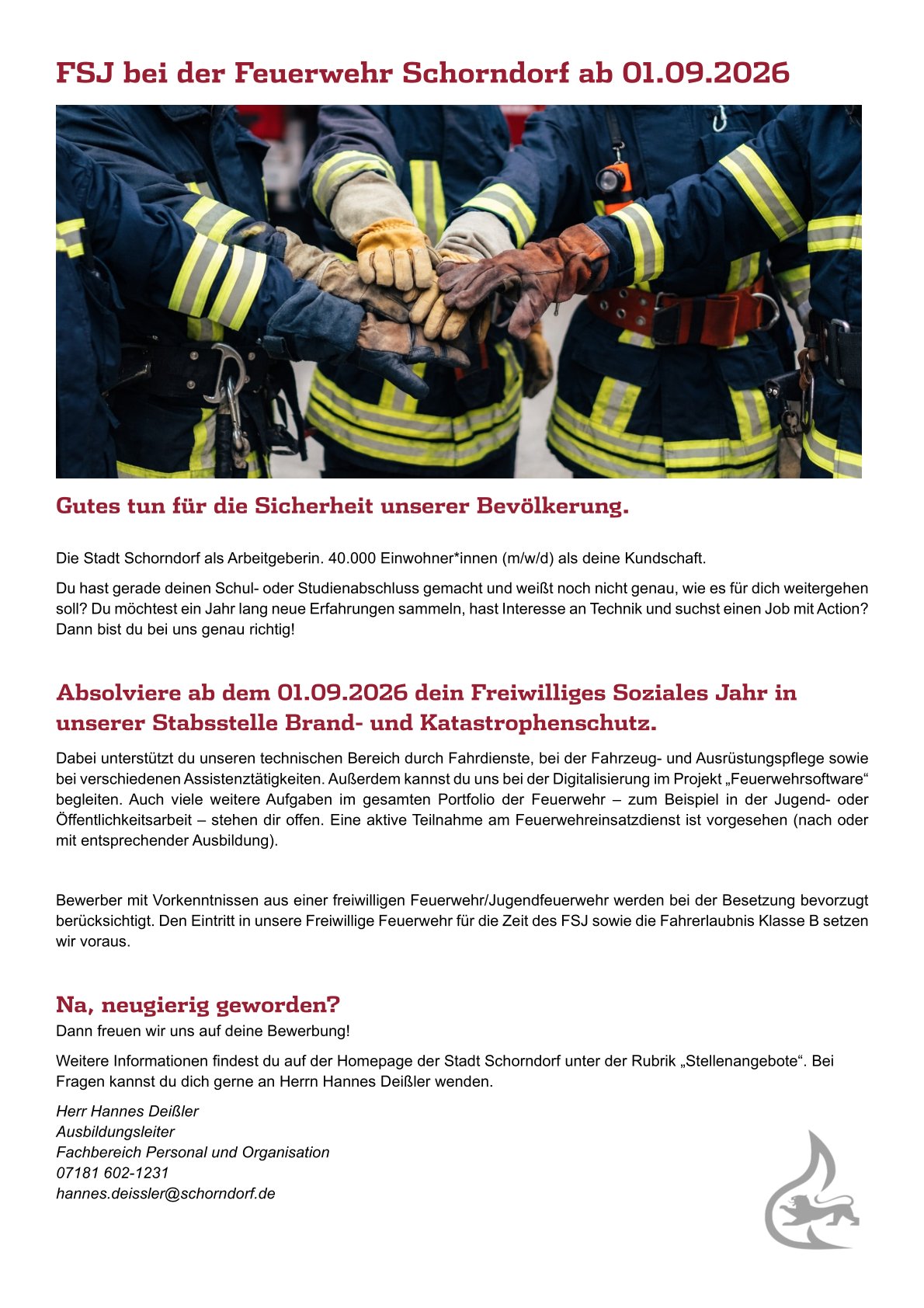 Absolviere ab dem 01.09.2026 dein Freiwilliges Soziales Jahr in unserer Stabsstelle Brand- und Katastrophenschutz.