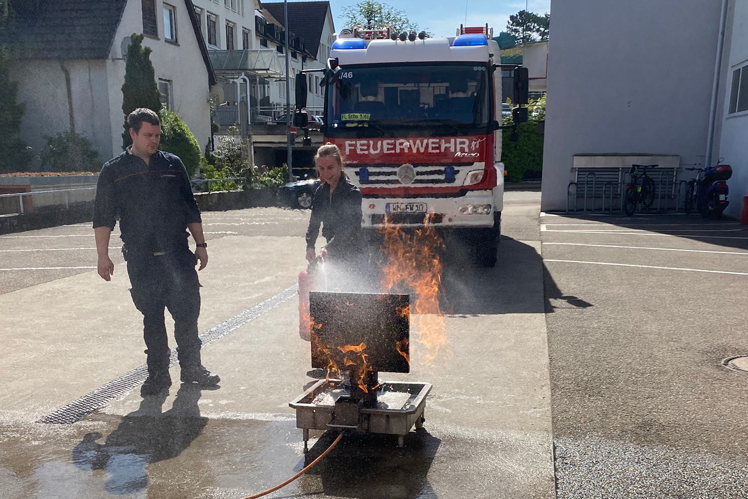 Der Höhepunkt des Vormittags war das Löschen eines Entstehungsbrands an einem gasbetriebenen Brandsimulator mit einem Übungsfeuerlöscher. Zum Abschluss wurde den Mädchen noch die Drehleiter vorgeführt.