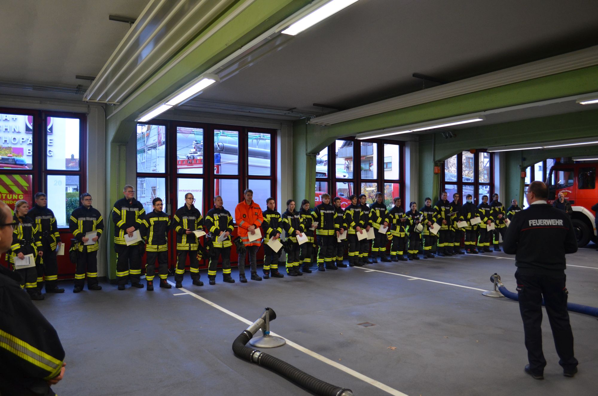 Dementsprechend umfangreich ist auch der Stundenplan. In insgesamt über 80 Stunden wurden sowohl theoretische als auch praktische Module abgearbeitet. So standen beispielsweise neben rechtlichen Grundlagen und der Struktur der Feuerwehr auch Fahrzeugkunde, der Umgang mit Löschgeräten, die Aufgaben der einzelnen Einheiten im Einsatz und Erste Hilfe auf dem Plan, bevor am vergangenen Samstag das neu erlernte Wissen der Teilnehmer in einem schriftlichen und praktischen Test auf die Probe gestellt wurde. Dieser konnte erfolgreich absolviert werden.