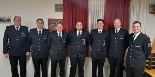 Das Feuerwehr-Ehrenzeichen in Bronze erhielten Florian Brecht und Robin Greiner für 15-jährige Dienstzeit, das Ehrenzeichen in Silber (25 Jahre) durften die Kameraden Torsten Fischer, Matthias Schwegler und Volker Wilhelm entgegennehmen.
