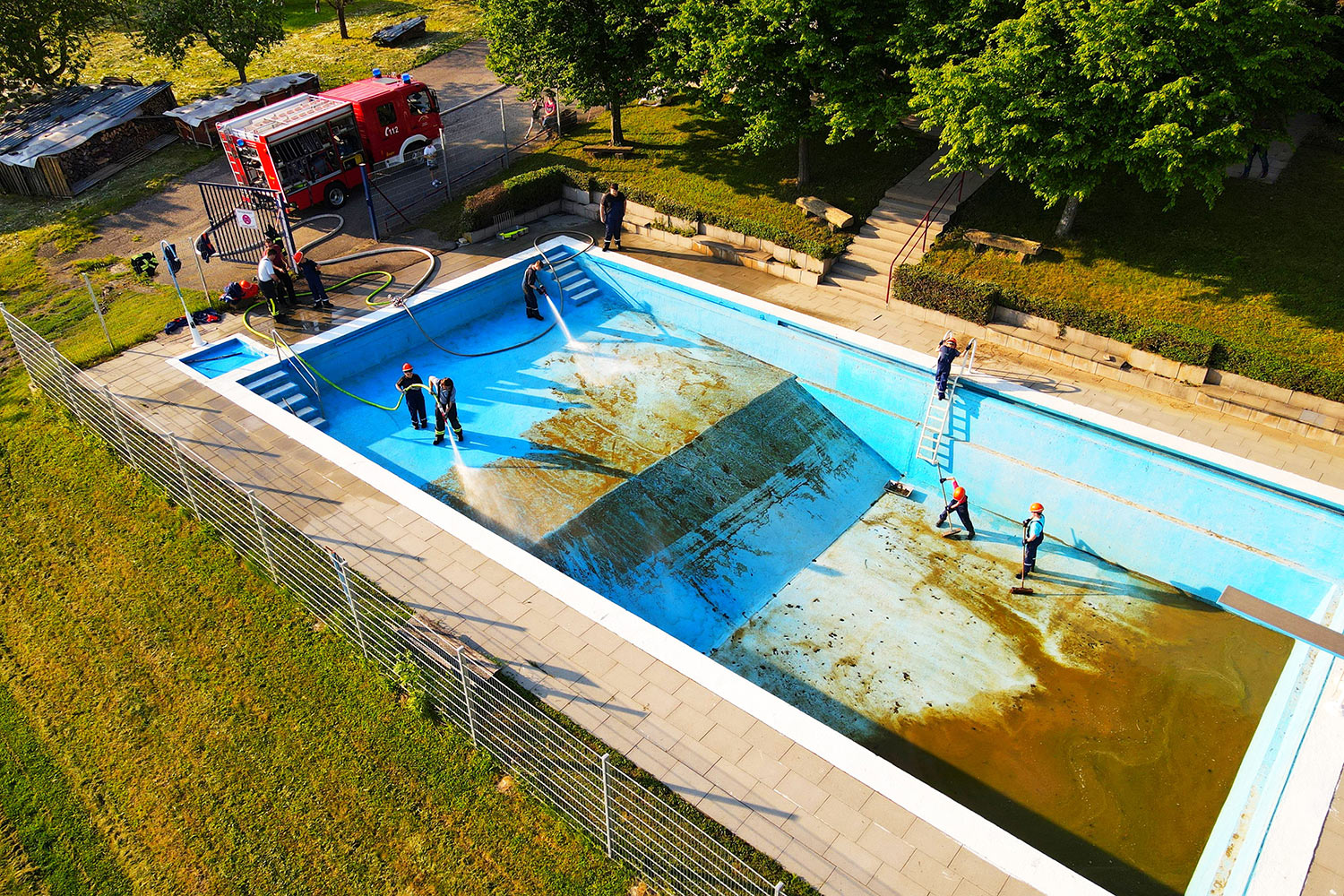 Das gesamte Schwimmbecken wurde von Schmutz und Ablagerungen befreit, sodass der Hochdruckreiniger nur noch wenig zu tun haben wird, bevor dann in den nächsten beiden Wochen die Farbe zum Einsatz kommt.