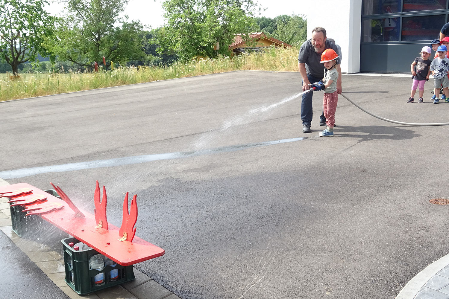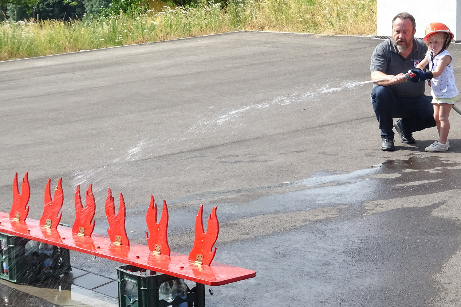 Anschließend gab es dann vor der Fahrzeughalle einen Löschangriff, natürlich ohne echtes Feuer, dafür aber mir echtem Feuerwehrschlauch und Strahlrohr. Die Aufgabe bestand darin, die aufgemalten Flammen in möglichst kurzer Zeit zu "löschen".