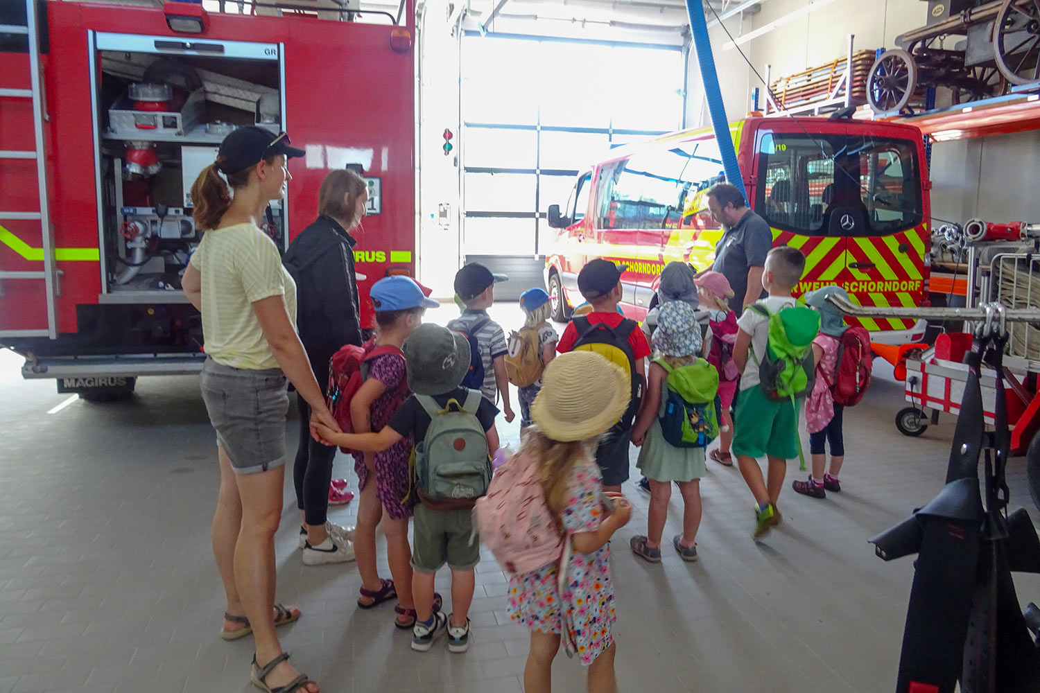 Treffpunkt war der Alarmeingang hinter dem Gebäude. Von dort gelangten die Kinder über die Umkleideräume in die Fahrzeughalle, ganz wie im richtigen Einsatz. Hier wurden die Feuerwehrfahrzeuge besichtigt und wer mochte, konnte in die Fahrzeuge einsteigen.