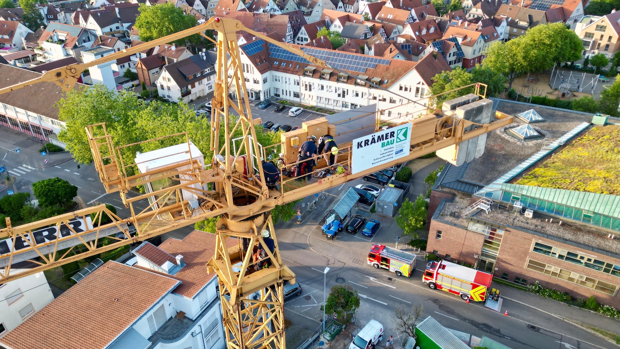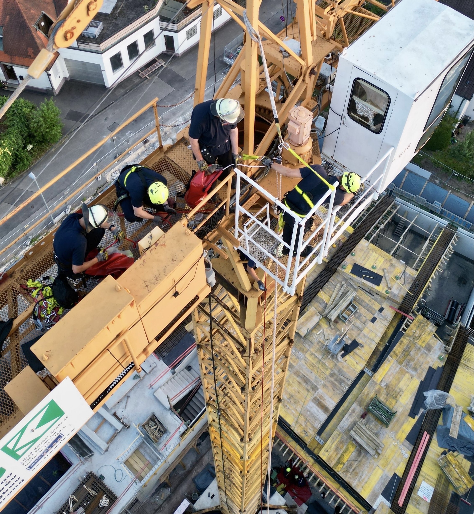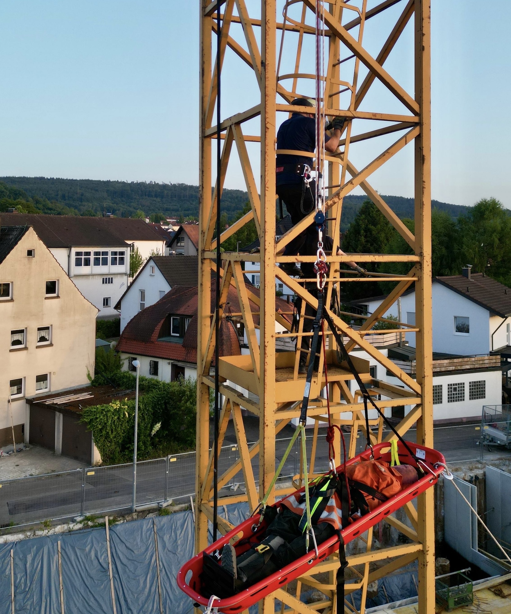 Das Übungsziel war klar, eine kontrollierte Rettung aus großer Höhe. Mithilfe eines Flaschenzugsystems und einer Schleifkorbtrage wurde die verunglückte Person aus dem Kran gehoben und schonend zu Boden gebracht.