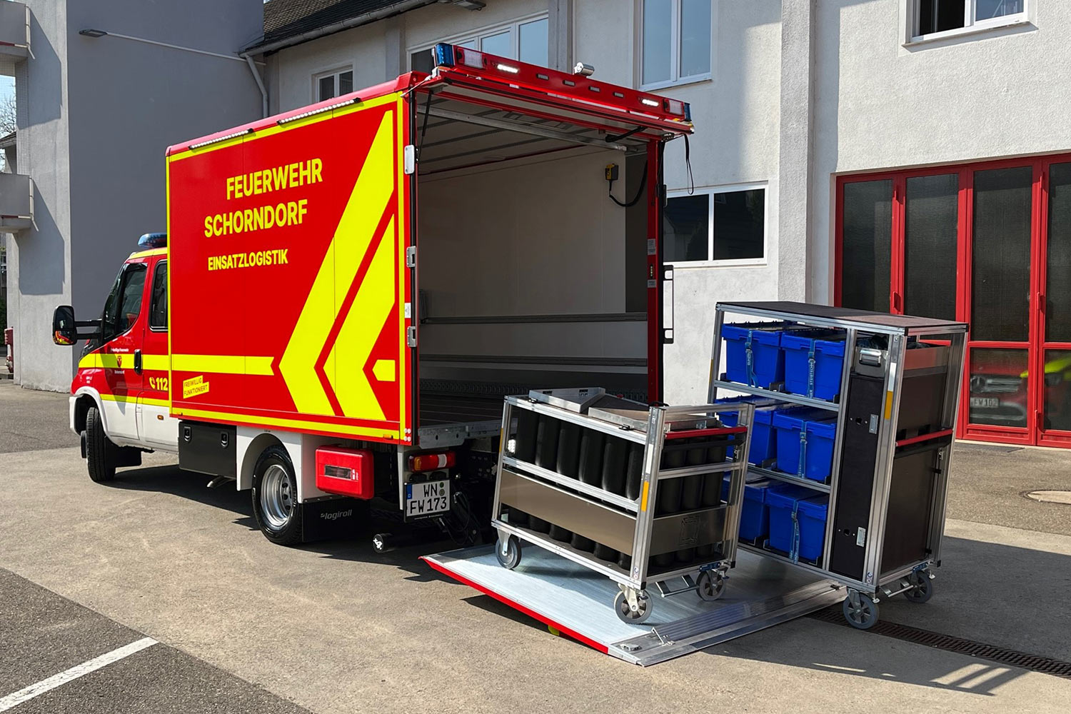 Bei dem Fahrzeug handelt es sich um einen 7,5 Tonnen schweren Transporter IVECO Daily mit 6 Sitzplätzen und einer Ladebordwand. Der Aufbau erfolgt durch die Firma Logiroll. Auf der Ladefläche können standardisierte und beladene Rollcontainer, aber auch Paletten und Gitterboxen mit Ladegut sicher transportiert werden.