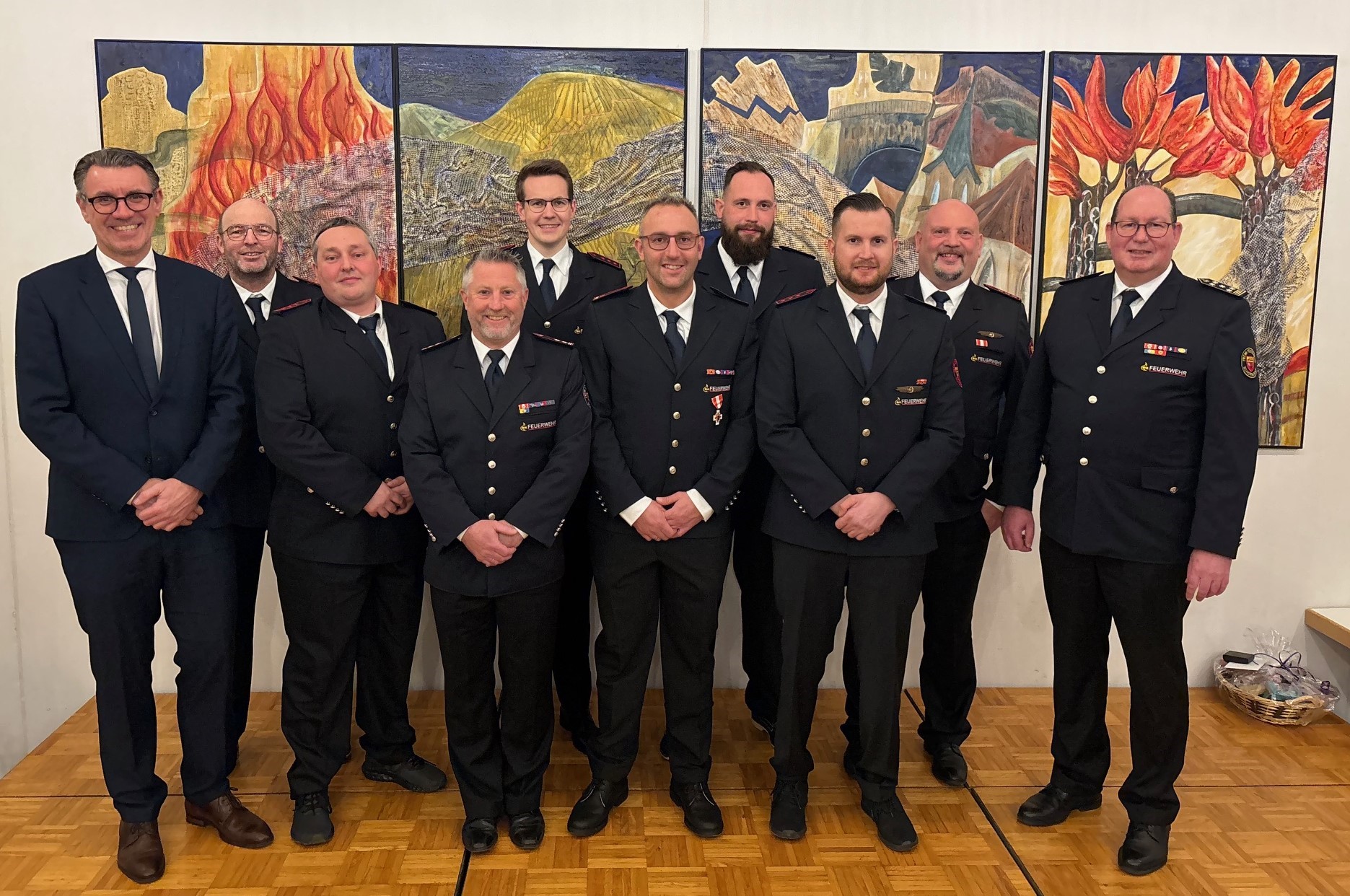 Im Anschluss wurden die Beförderungen vorgenommen. Florent Collenot wurde zum Feuerwehrmann in Probezeit, Andreas Mühl und Lucas Szontag wurden zum Feuerwehrmann befördert. Aufgrund ihrer Dienstzeit und Ausbildungen wurden Jochen Holderle und Marco Leon zum Hauptfeuerwehrmann und Simon Buchmann zum Löschmeister befördert.