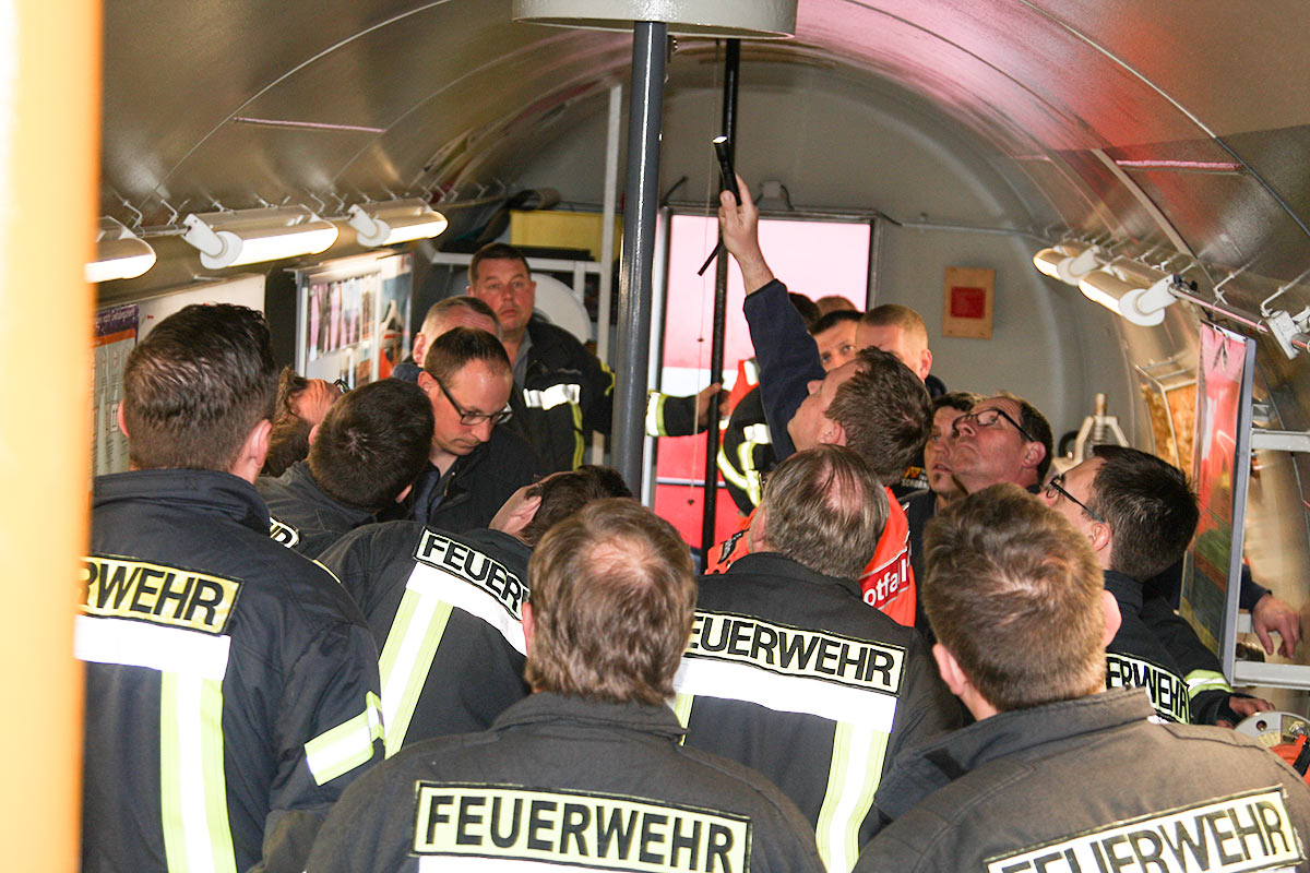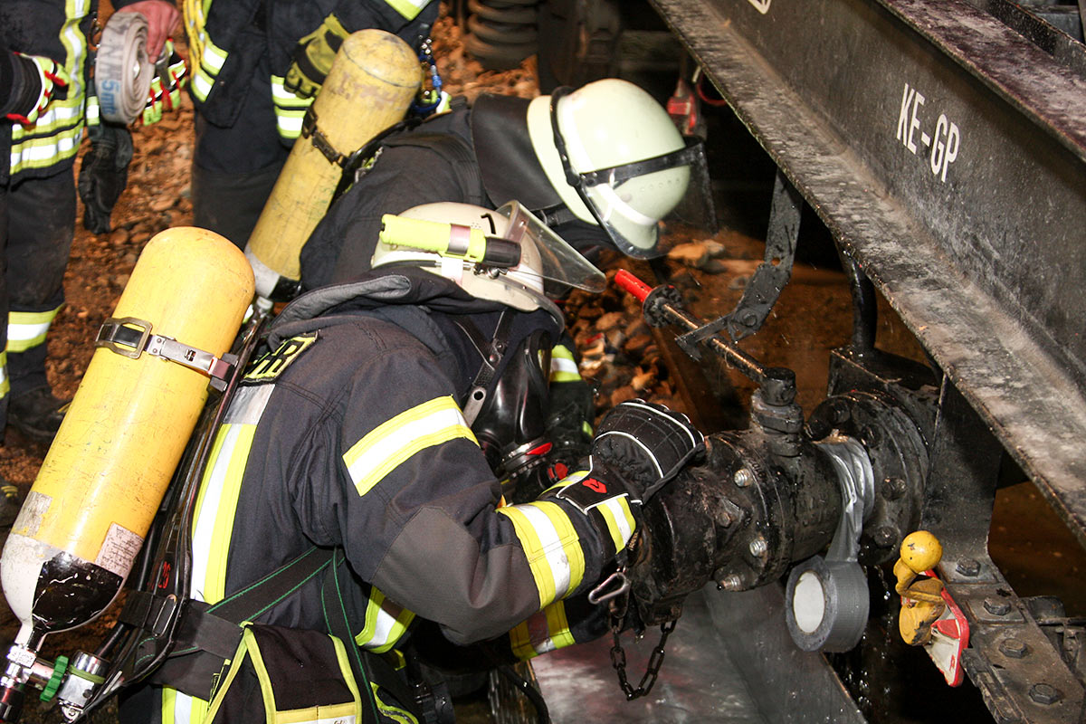 Als noch anspruchsvoller stellten sich aber die praktischen Übungen dar. Der Kesselwagen des Übungskesselwagens kann neun verschiedene Leckagen, Löcher und Risse simulieren. Die Aufgabe der jeweiligen Gruppe bestand darin, die Ausbreitung des auslaufenden Stoffes einzudämmen und nach Möglichkeit die Leckage abzudichten. Nahezu die komplette Beladung des neuen Rüstwagens konnte hier eingesetzt und der praktische Umgang an reellen Einsatzstellen vertieft werden. Manchmal genügte aber auch schon ein im Gleisbett liegender Holzpflock, um ein Loch vollständig zu verschließen. Ein anderer Riss war wiederum so komplex, dass selbst die ausgefeilteste Konstruktion ein weiteres Auslaufen nicht verhindern konnte. Da bleibt dann nur das konsequente Auffangen des auslaufenden Stoffes.