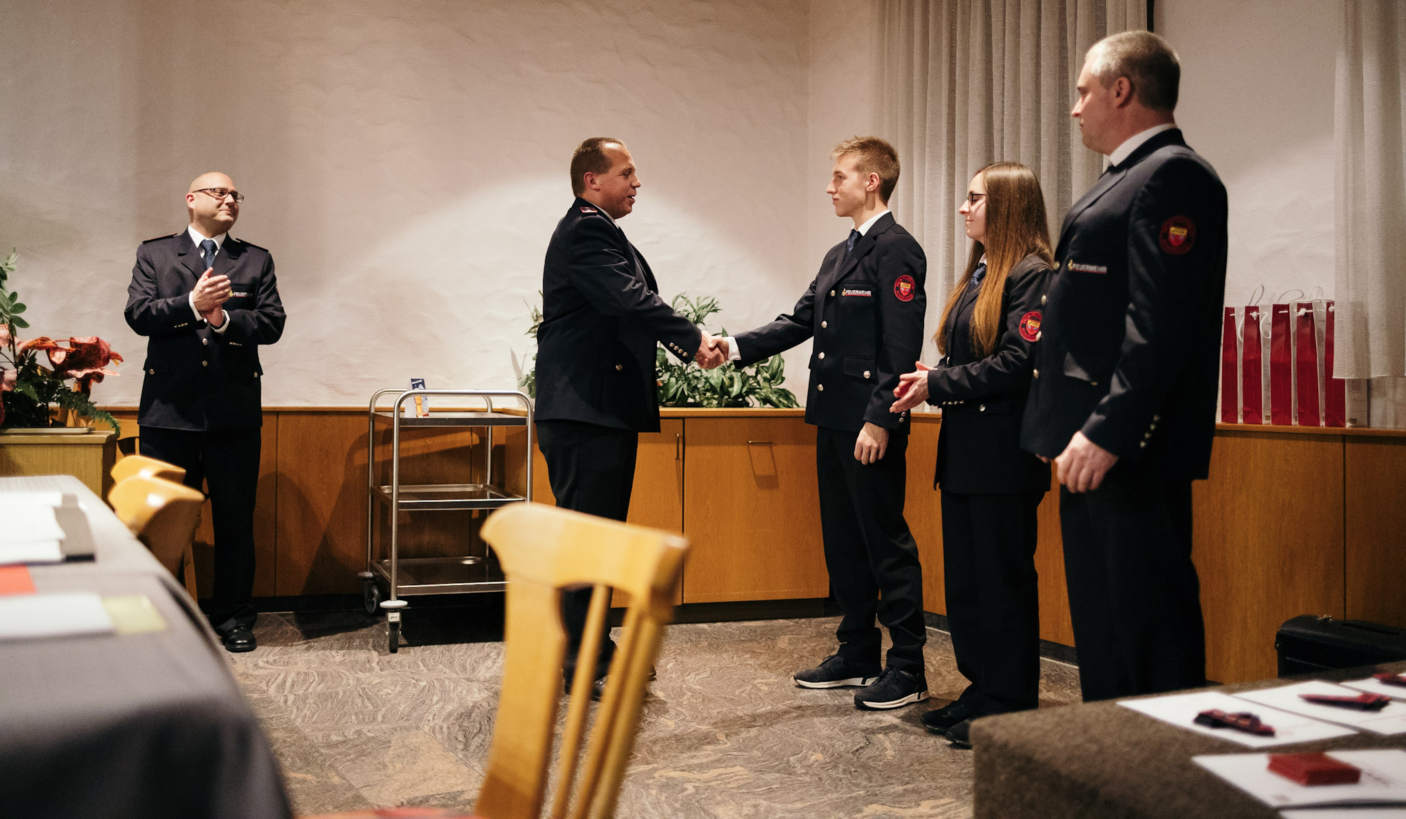 Lea Estenfeld, Markus Bareiß und Mika Gertz wurden per Handschlag in die aktive Wehr aufgenommen. Den drei Aufnahmen stehen vier Austritte entgegen. Somit besteht die Wehr aus 51 aktiven Einsatzkräften.