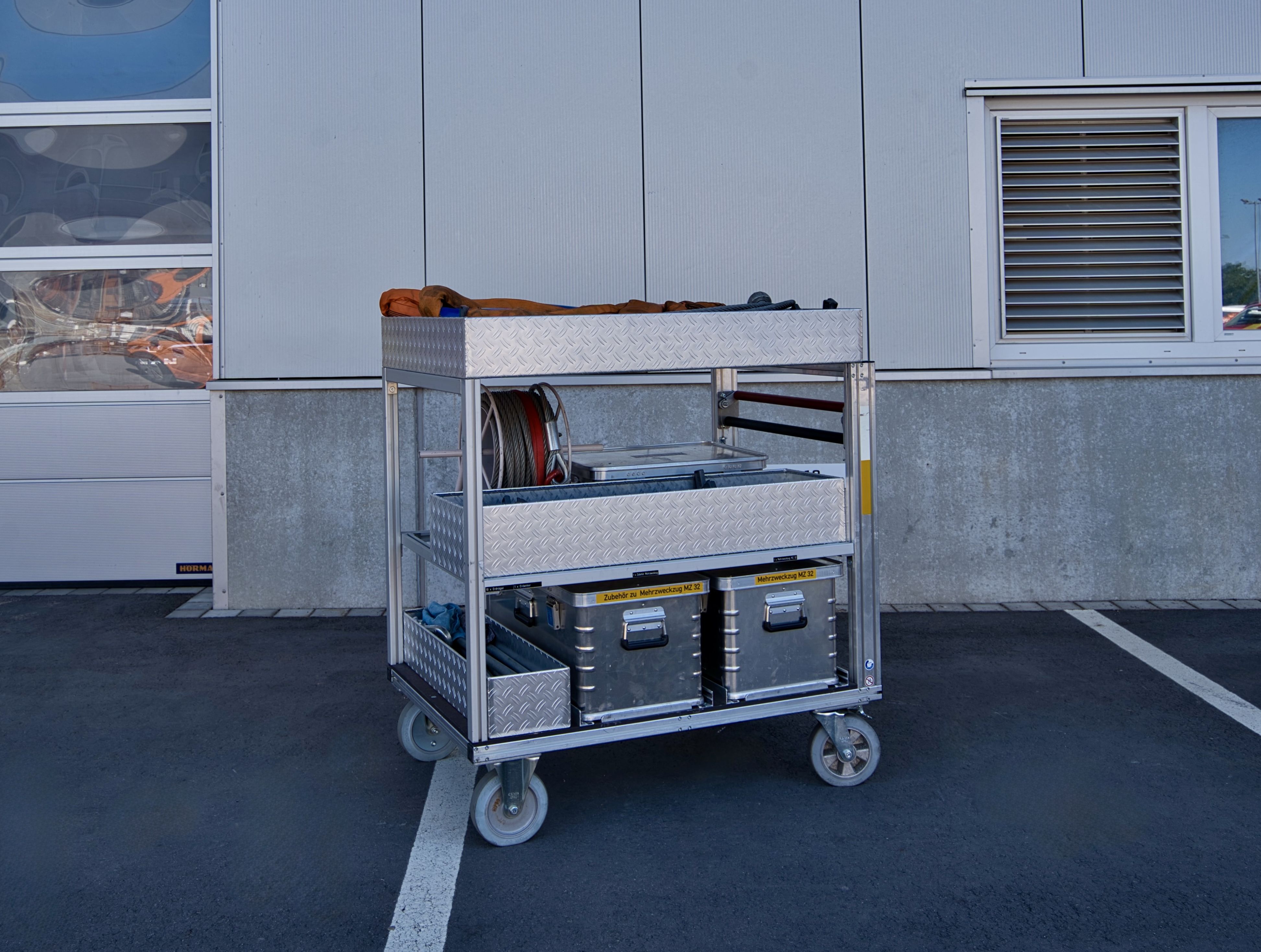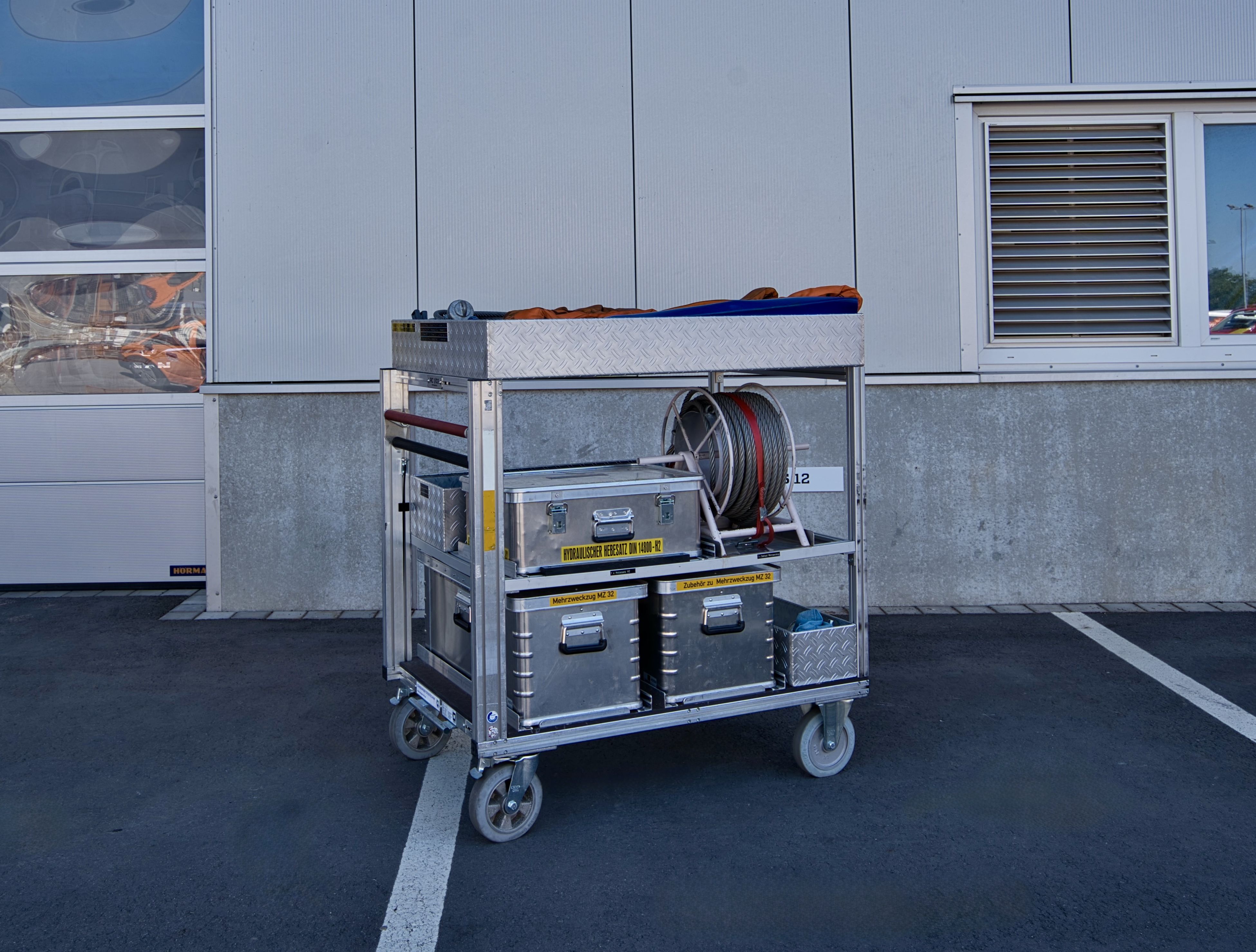 - Dieser Rollwagen bringt schweres Gerät wie einen Mehrzweckzug (MZ 32), einen Hebesatz und diverse hochbelastbare Rundschlingen sowie Kanalstreben zur Einsatzstelle. Er wird eingesetzt, um schwere Lasten zu bewegen oder Gräben zu sichern.
