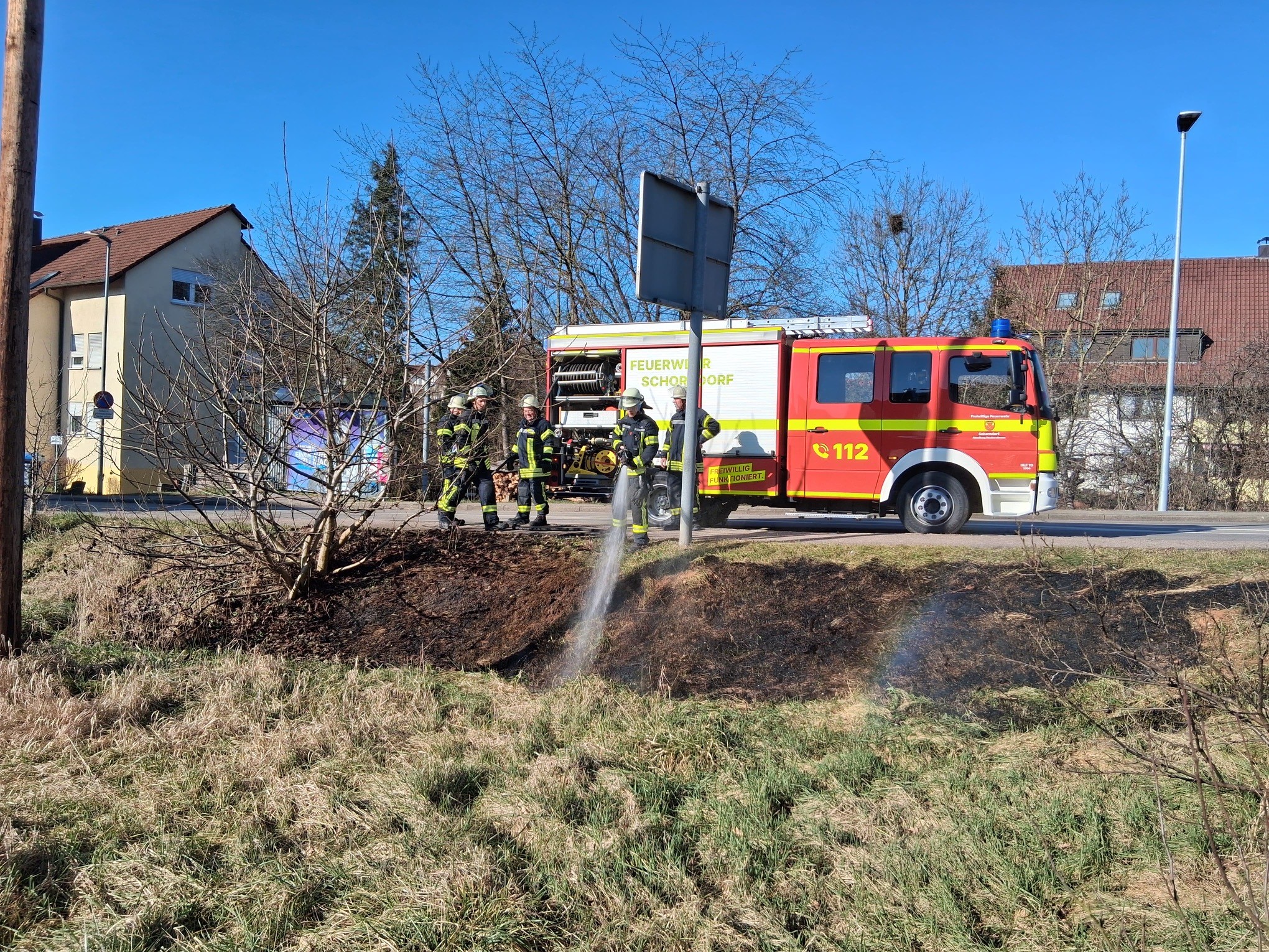 Zum zweiten Einsatz an diesem Mittwoch musste die Feuerwehr Schorndorf zu einem Flächenbrand ausrücken. Die brennende Böschung wurde mit einem Rohr abgelöscht.