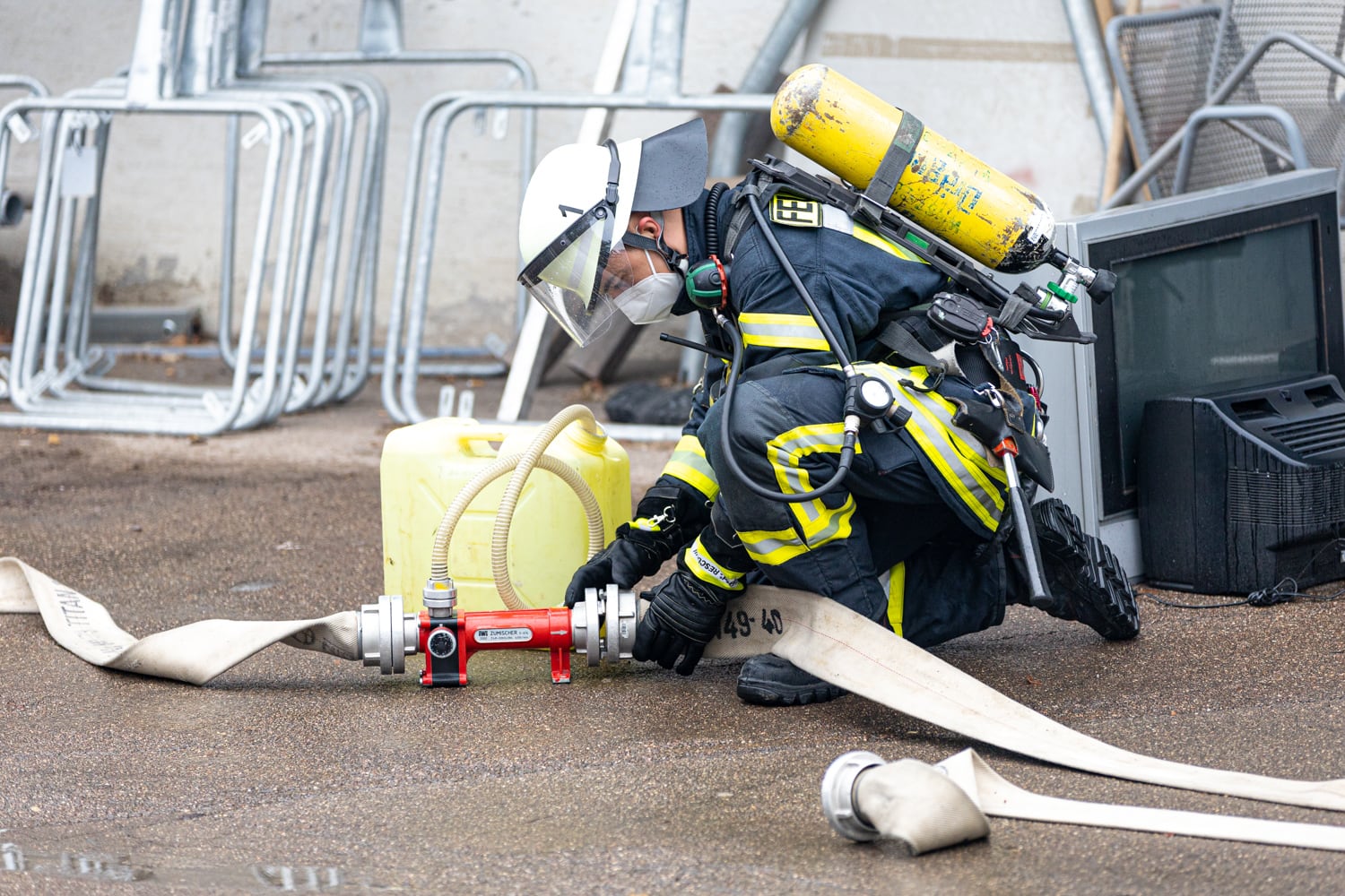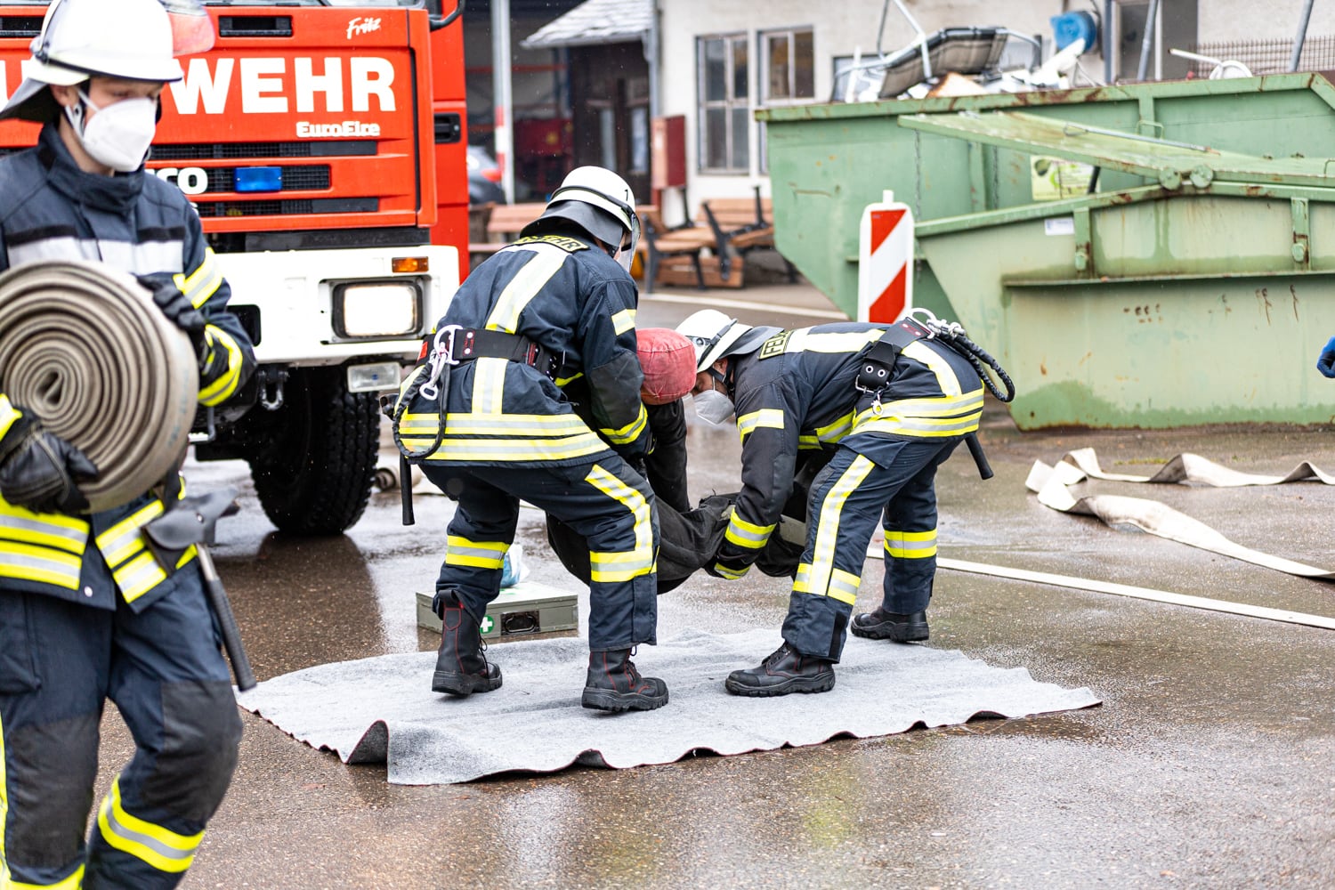 In einer großen Abschlussübung konnten die Nachwuchsfeuerwehrleute ihr Können zahlreichen Zuschauern, darunter viele Familienangehörige, präsentieren. Bei der Übung auf dem Baubetriebshof der Zentralen Dienste wurde angenommen, dass ein Fahrer beim Abbiegen in eine Seitenstraße die Kontrolle über sein Fahrzeug verlor und in einen Hauseingang fuhr. Durch den Aufprall fing das Fahrzeug im Motorraum Feuer, der Brand drohte auf das Gebäude überzugreifen.