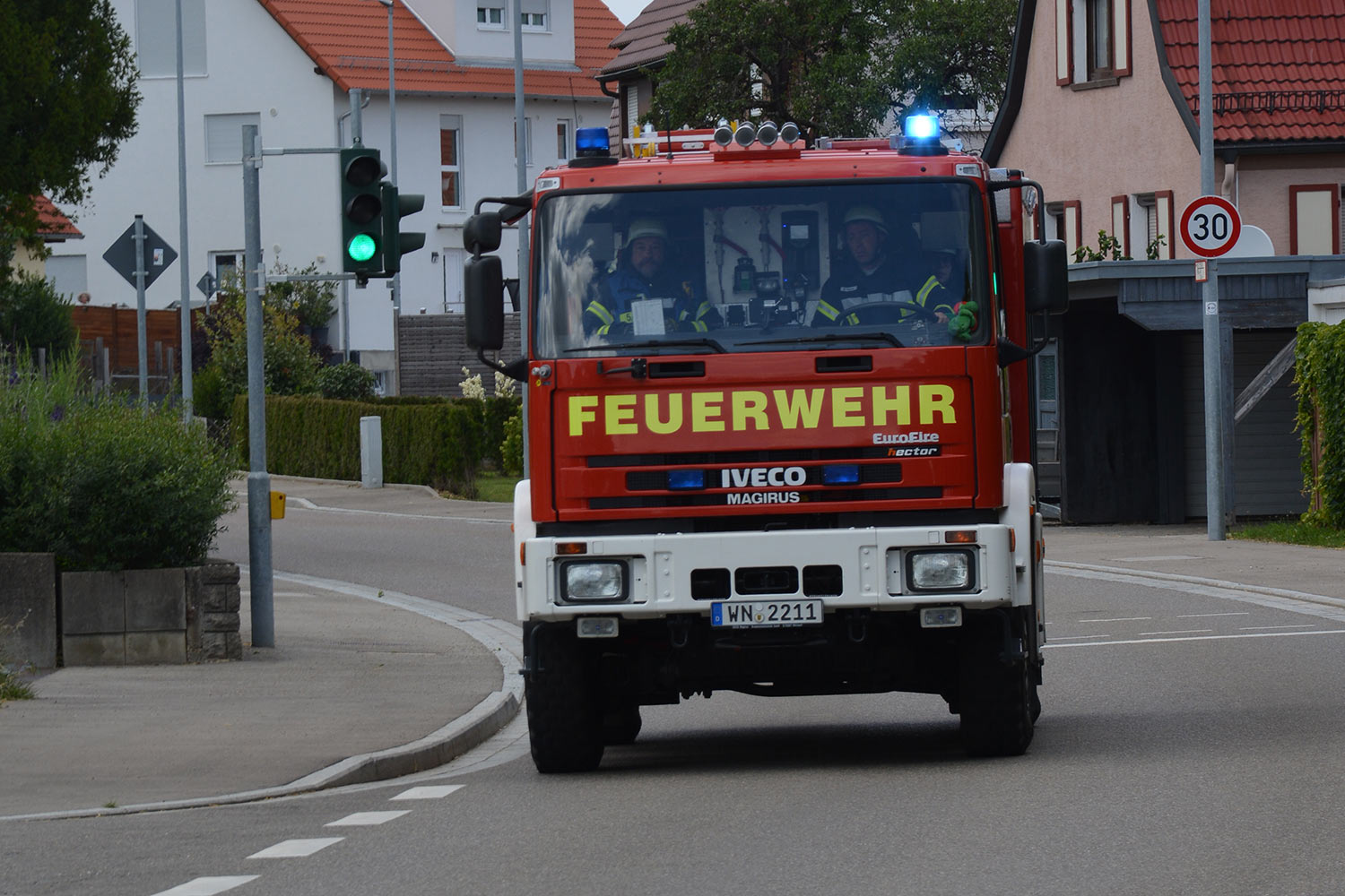 Nach dem Eintreffen der Einsatzkräfte an der Einsatzstelle wurde von der Wangener Straße her eine Wasserversorgung aufgebaut. Ein mit umluftunabhängigem Atemschutz ausgerüsteter Angriffstrupp konnte die drei vermissten Jugendlichen im Umkleidebereich der verrauchten Schurwaldhalle schnell auffinden, retten und an vor dem Gebäude bereitstehende Kameraden zur Betreuung übergeben.