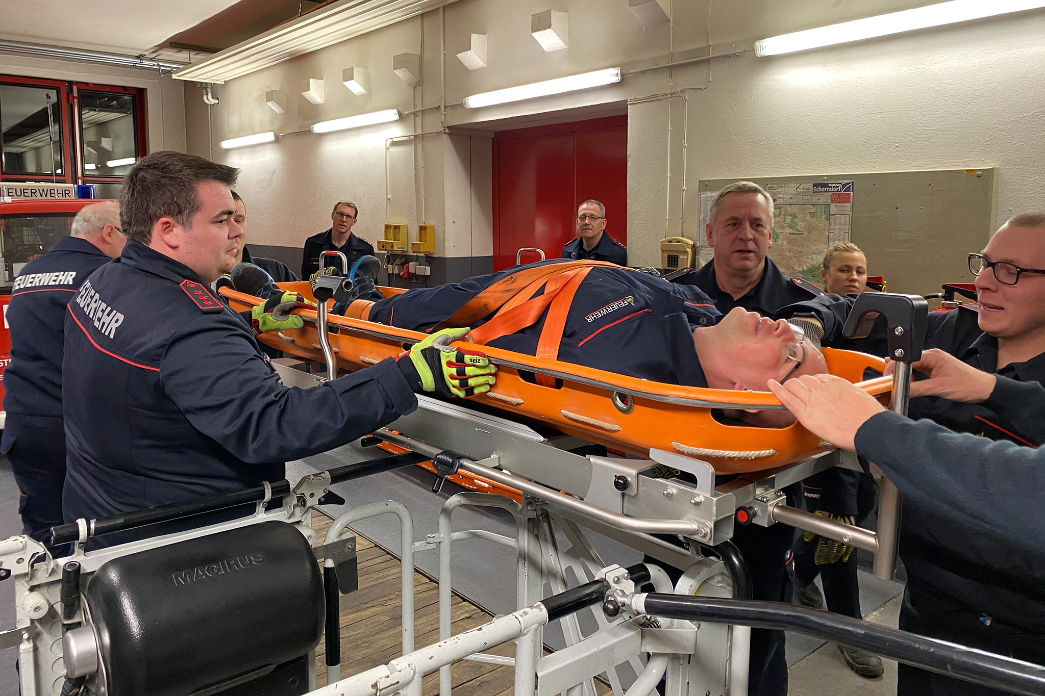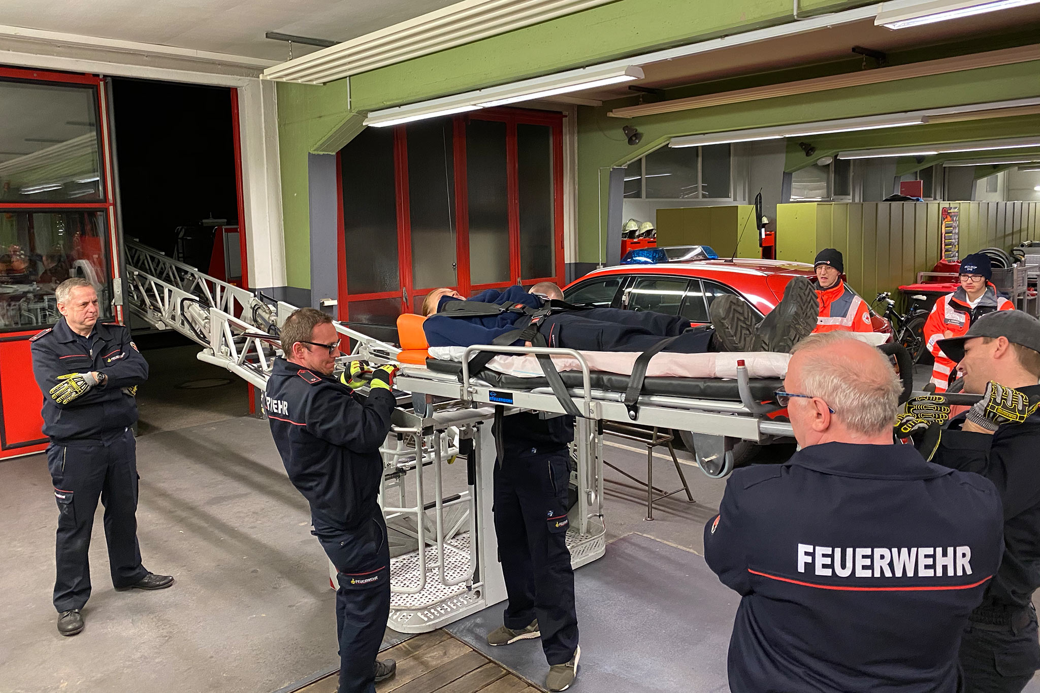 Außerdem wurde der Umgang mit der neuen Krankentragenlagerung der Drehleiter trainiert. Diese kommt meistens dann zum Einsatz, wenn Personen schonend aus oberen Stockwerken gerettet werden müssen und ein Transport durch das Treppenhaus nicht möglich ist. Elf mal war dies im vergangenen Jahr der Fall. Mit dem neu beschafften Modell kann nicht nur die Krankentrage des Rettungsdienstes, sondern auch die Schleifkorbtrage, sicher transportiert werden.