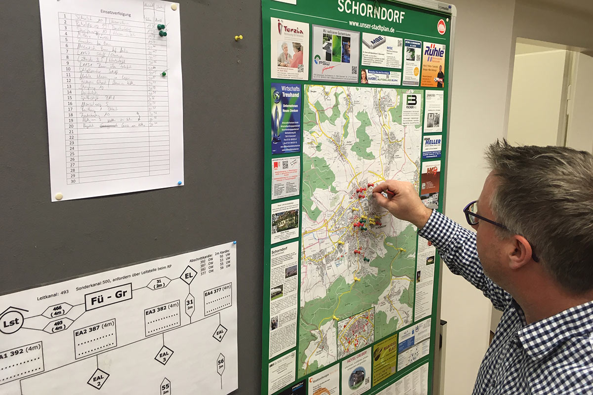 Übungsannahme am Donnerstag war ein lokales Unwetterereignis im Großraum Schorndorf. Was sich anfangs auf einzelne vollgelaufene Keller beschränkte, weitete sich in der Folge auf abgedeckte Dächer, umgestürzte Bäume und verunfallte Fahrzeuge aus. Als Höhepunkt musste die Auslösung einer Brandmeldeanlage abgearbeitet werden. Die besondere Herausforderung war hier, dass alle Fahrzeuge bereits disponiert waren und für das betroffene Objekt eine starke Rauchentwicklung im Keller bestätigt wurde.