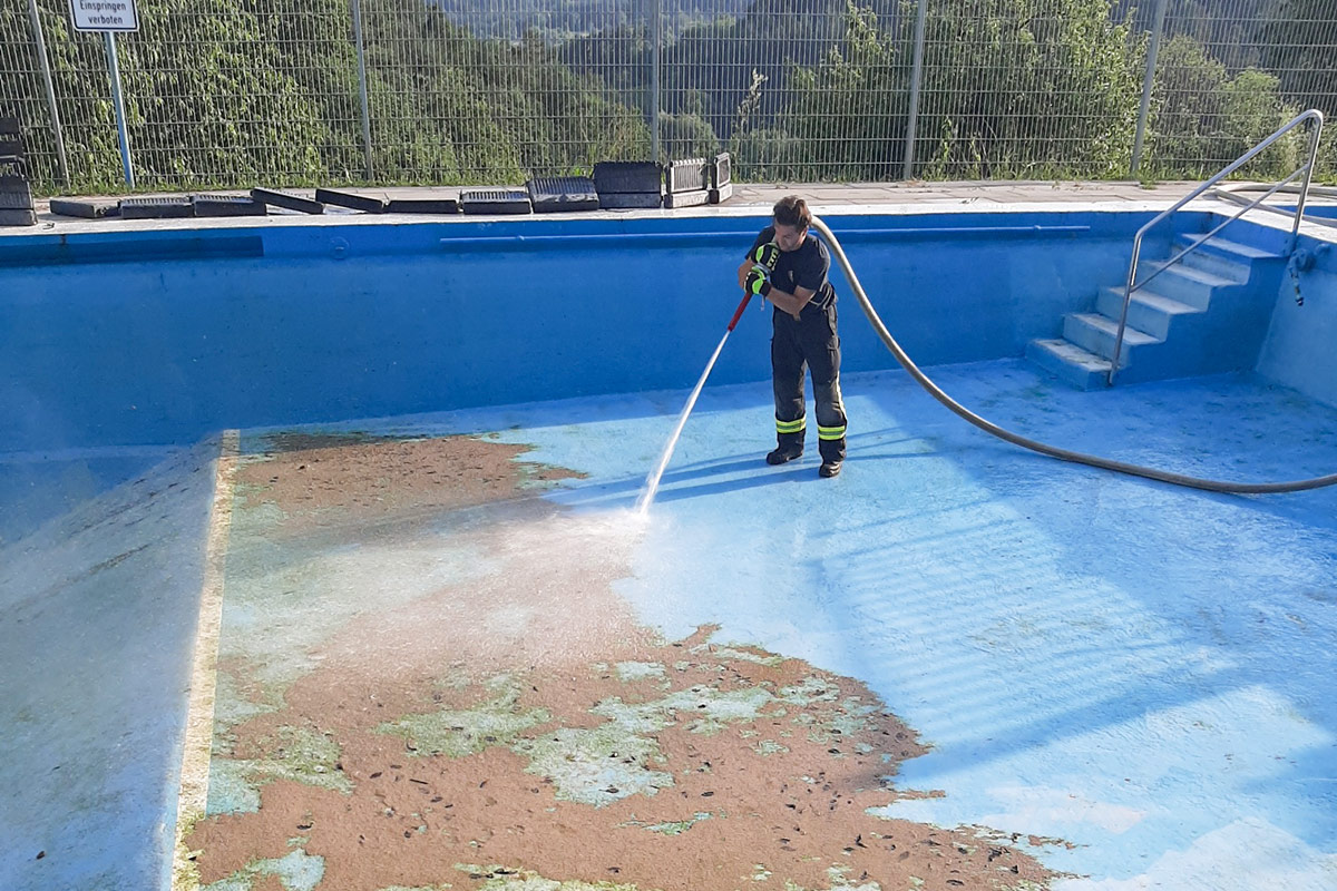 Nach der Wiederaufnahme des regelmäßigen Übungs- und Dienstbetriebes bei der Feuerwehr Schorndorf wurde sofort die Gelegenheit genutzt und das Becken gereinigt. Da das Becken der Feuerwehr ganzjährig als Löschteich dient und das Wasser coronabedingt zwei Jahre nicht gewechselt worden war, hatte sich eine ganze Menge Schmutz angesammelt. Trotz der hochsommerlichen Temperaturen von über 30 Grad war es eine Freude und ein gelungener Beitrag der Abteilung Buhlbronn zur diesjährigen Öffnung des Freibads, der nun mit einem strahlend blauen und sauberen Becken nichts mehr im Wege steht.