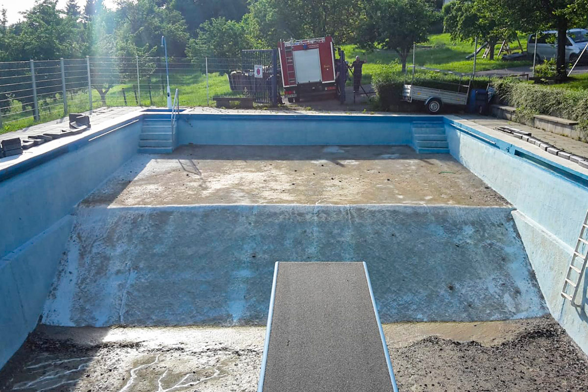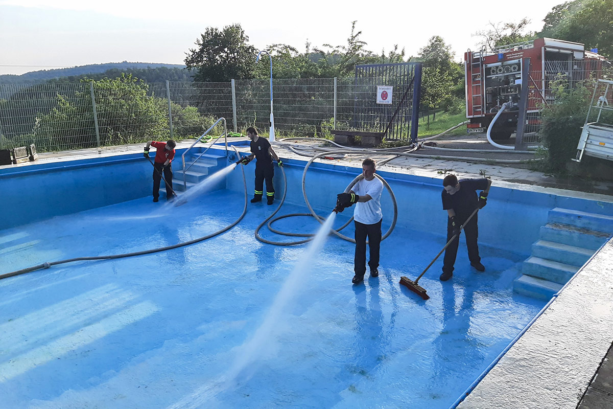 Erfreulicherweise wurde von Seiten der Stadtverwaltung beschlossen, dieses Jahr das Freibad in Buhlbronn zu eröffnen. Für die Feuerwehrabteilung Buhlbronn war es daher selbstverständlich, wieder bei der Auswinterung und der Reinigung des Beckens zu unterstützen.