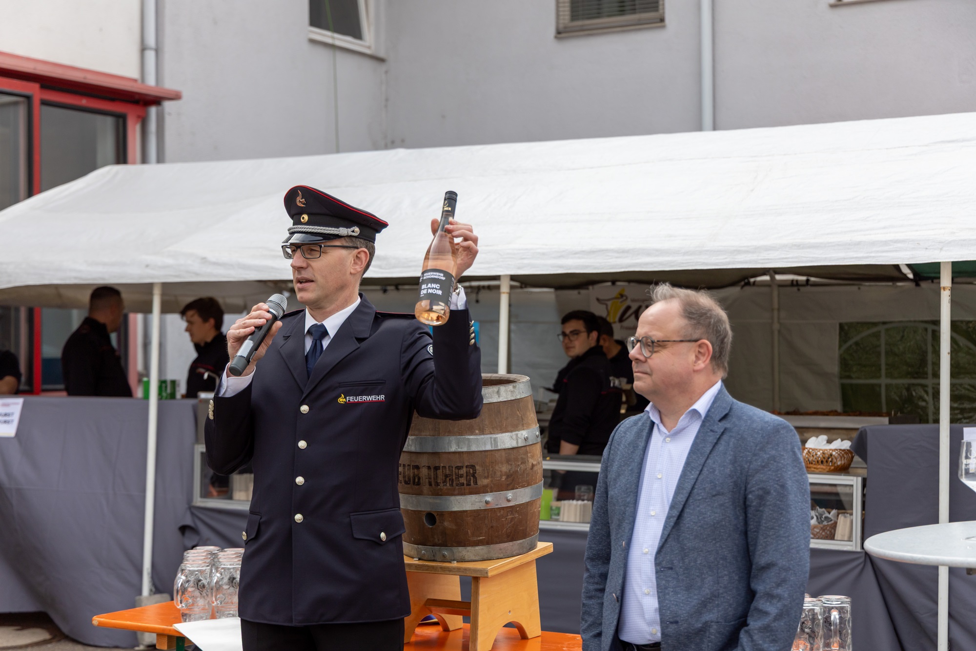 Für das leibliche Wohl sorgten die Mitglieder der Einsatzabteilung mit einer großen Auswahl an Speisen und Getränken. Neu im Angebot waren in diesem Jahr Falafel sowie der eigens produzierte „Feuerwehrwein“ – ein Weißwein, der in Kooperation mit dem Weingut Escher aus Schwaikheim gekeltert wurde. Besonders dabei: Der Weinberg wird von Mitgliedern der Einsatzabteilung in ihrer Freizeit gepflegt, vom Rebschnitt bis zur Traubenlese. Die Falafel auf Salat ergänzten dieses Jahr das vegetarische Angebot und überzeugten geschmacklich.