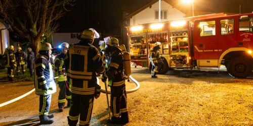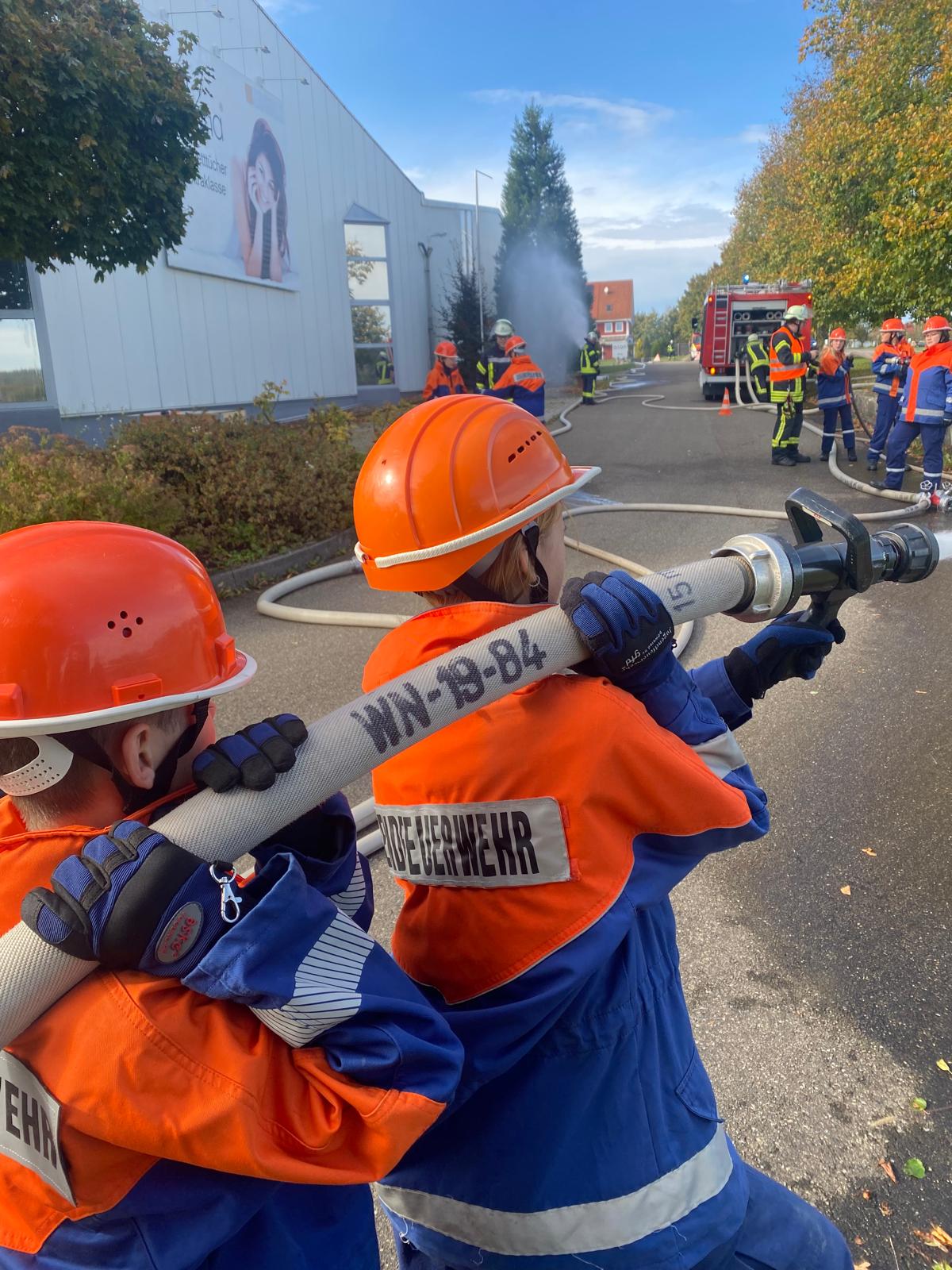 Die Jugendgruppe löschte in einem eigenständigen Löschaufbau den Flächenbrand, während die Einsatzabteilung das Feuer im Firmengebäude sowohl im Innen- wie im Außenangriff bekämpfte.