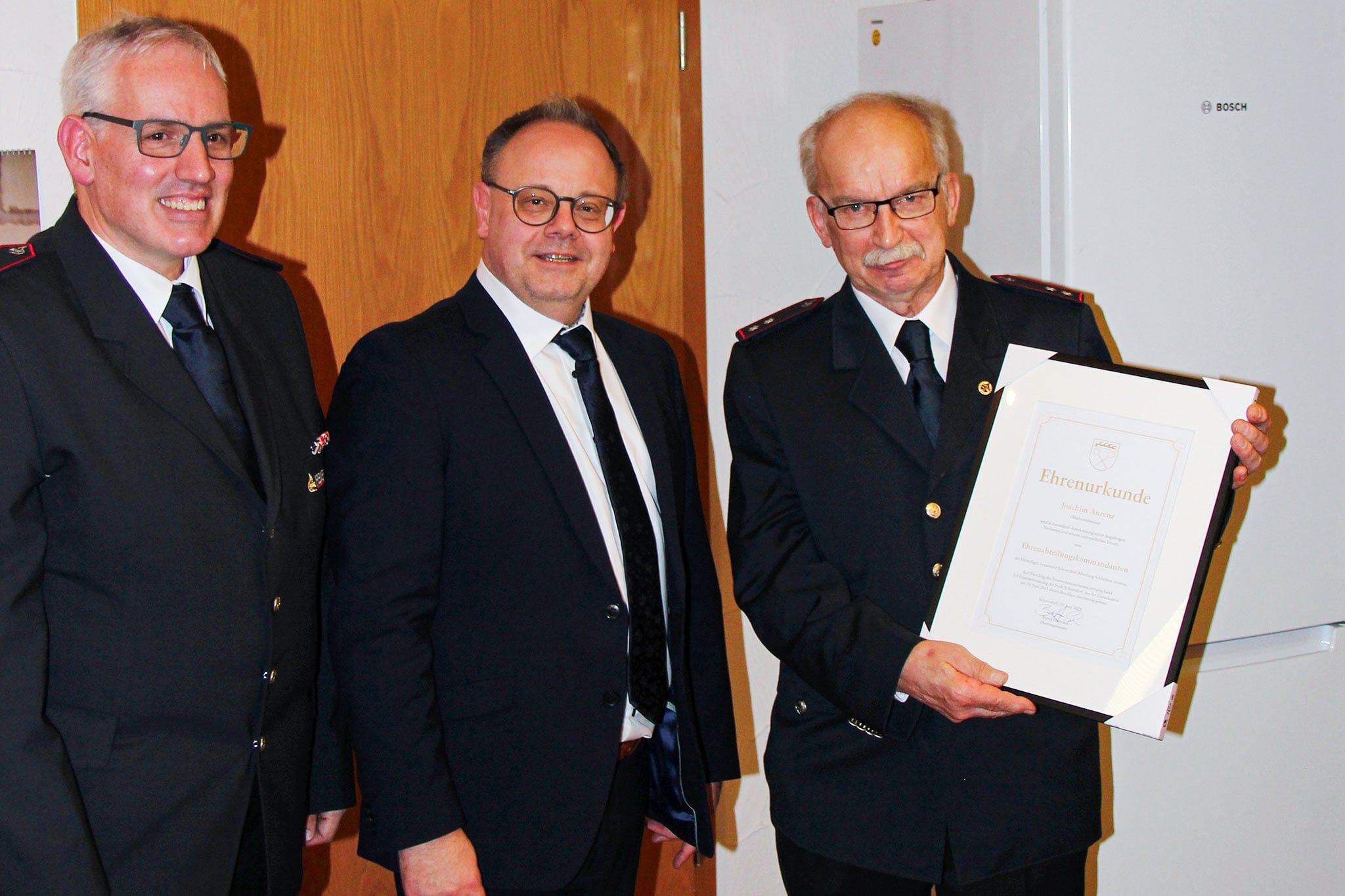 Benjamin Aurenz und Steffen Hofele erhielten für 25 Jahre aktiven Feuerwehrdienst das Feuerwehr-Ehrenabzeichen in Silber, übergeben durch Oberbürgermeister Bernd Hornikel und Kommandant Bruckner, sowie Abteilungskommandant Gunter Pfeil. Einen besonderen Höhepunkt bildete die Ernennungen des ehemaligen Abteilungskommandanten Joachim Aurenz (1990 bis 2015) zum Ehrenabteilungskommandanten der Freiwilligen Feuerwehr Schorndorf Abteilung Schlichten. Oberbürgermeister Bernd Hornikel übergab die Urkunde mit Gemeinderatsbeschluss vom Juni des vergangenen Jahres.
