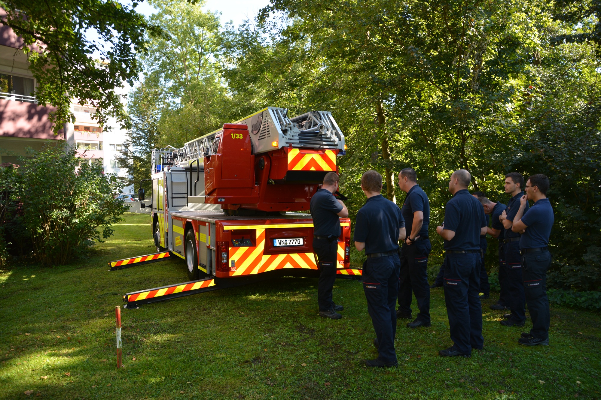 Neben den theoretischen Grundlagen wie Unfallverhütungsvorschriften, Aufgaben der Fahrzeugbesatzung und Baurecht stand die praktische Ausbildung klar im Vordergrund. Bereits am ersten Samstag wurde die Drehleiter vermessen, hierbei wurden Überhänge, Freistandsgrenzen, Fahrzeugmaße, Abstützmaße und weitere Kennzahlen ermittelt.