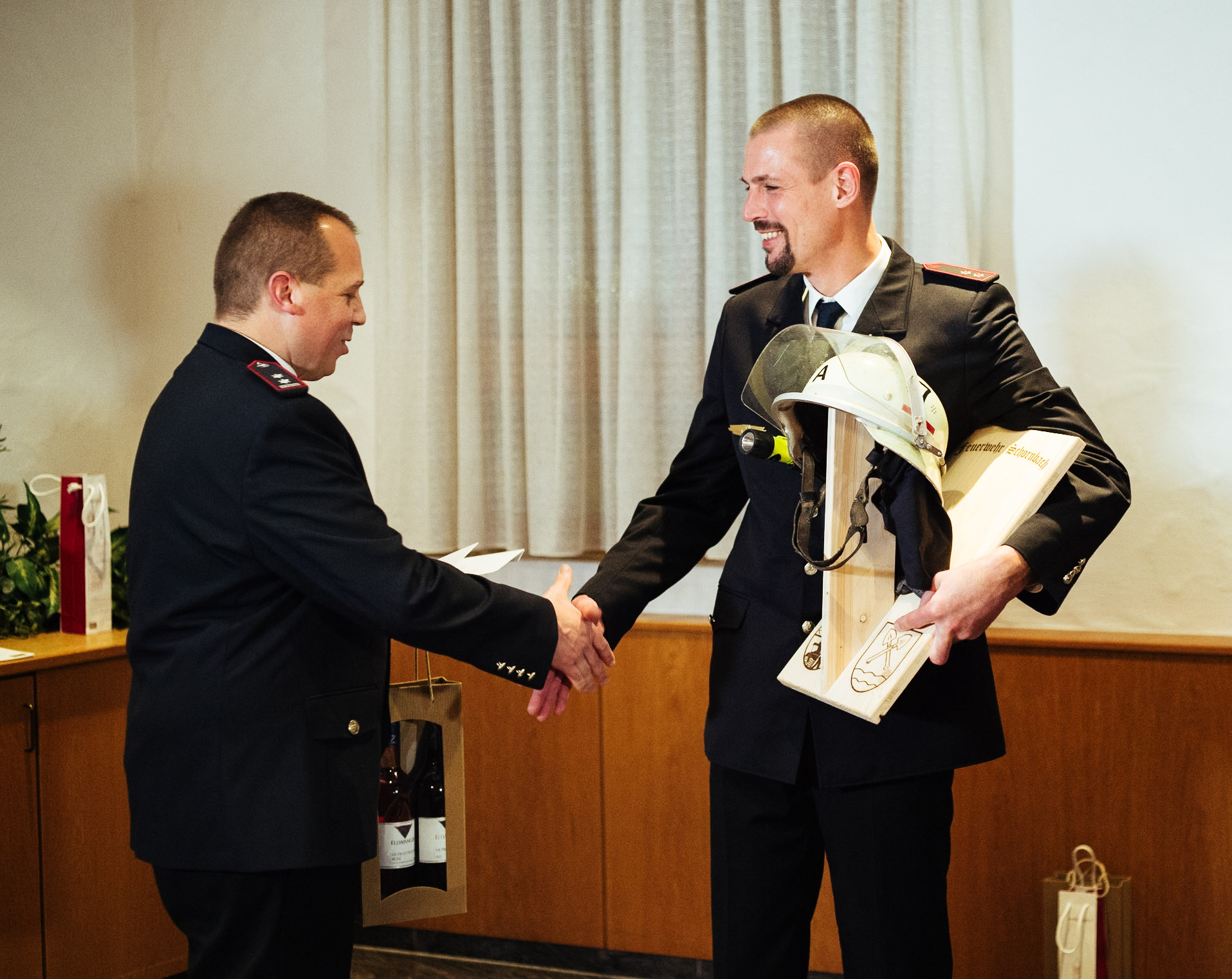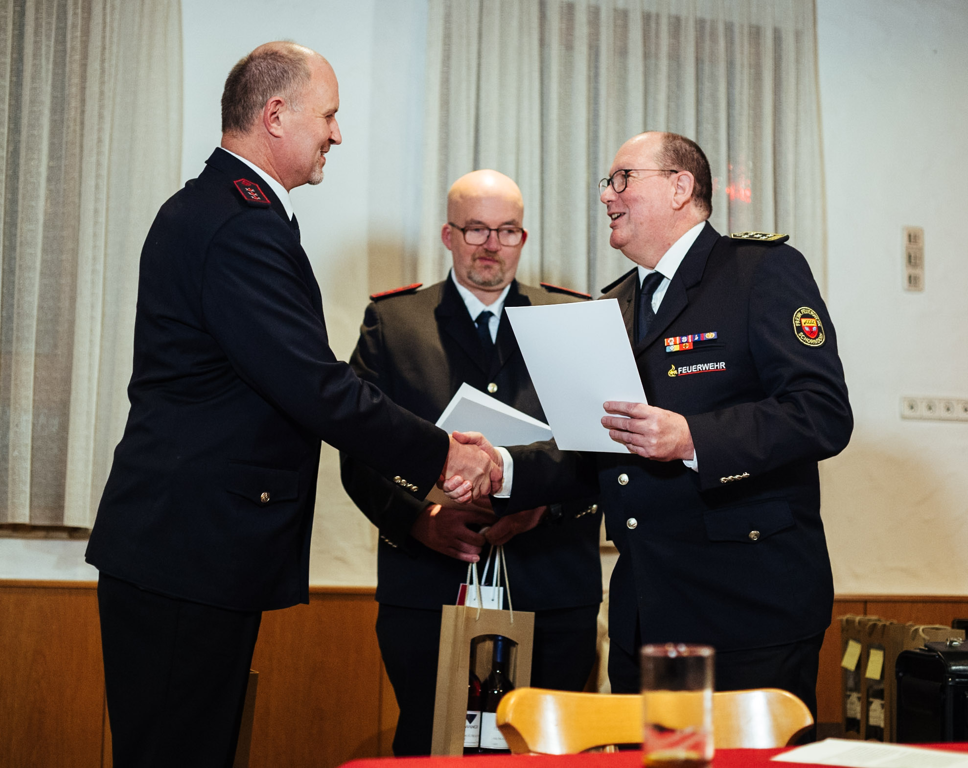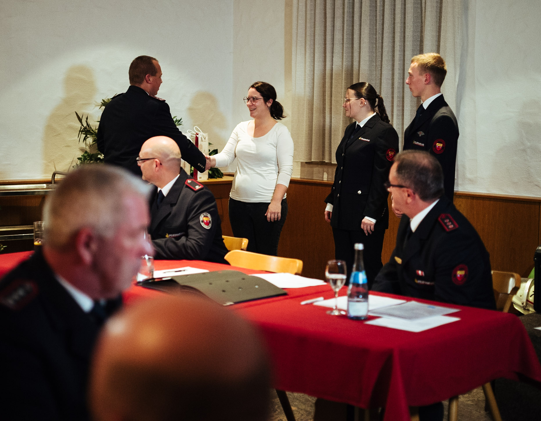 Sarah Kluge, Sabrina Lex und Paul Püschl wurden per Handschlag in die aktive Wehr aufgenommen. Den drei Aufnahmen steht der Austritt von Uwe Krauss entgegen. Er wird zum Jahresende die Feuerwehr verlassen und ins Allgäu ziehen. Wir wünschen ihm auf seinem weiteren Weg alles Gute. Somit besteht die Wehr aus 52 aktiven Einsatzkräften.