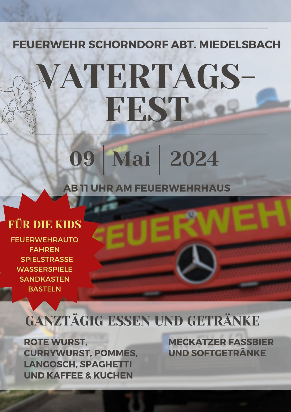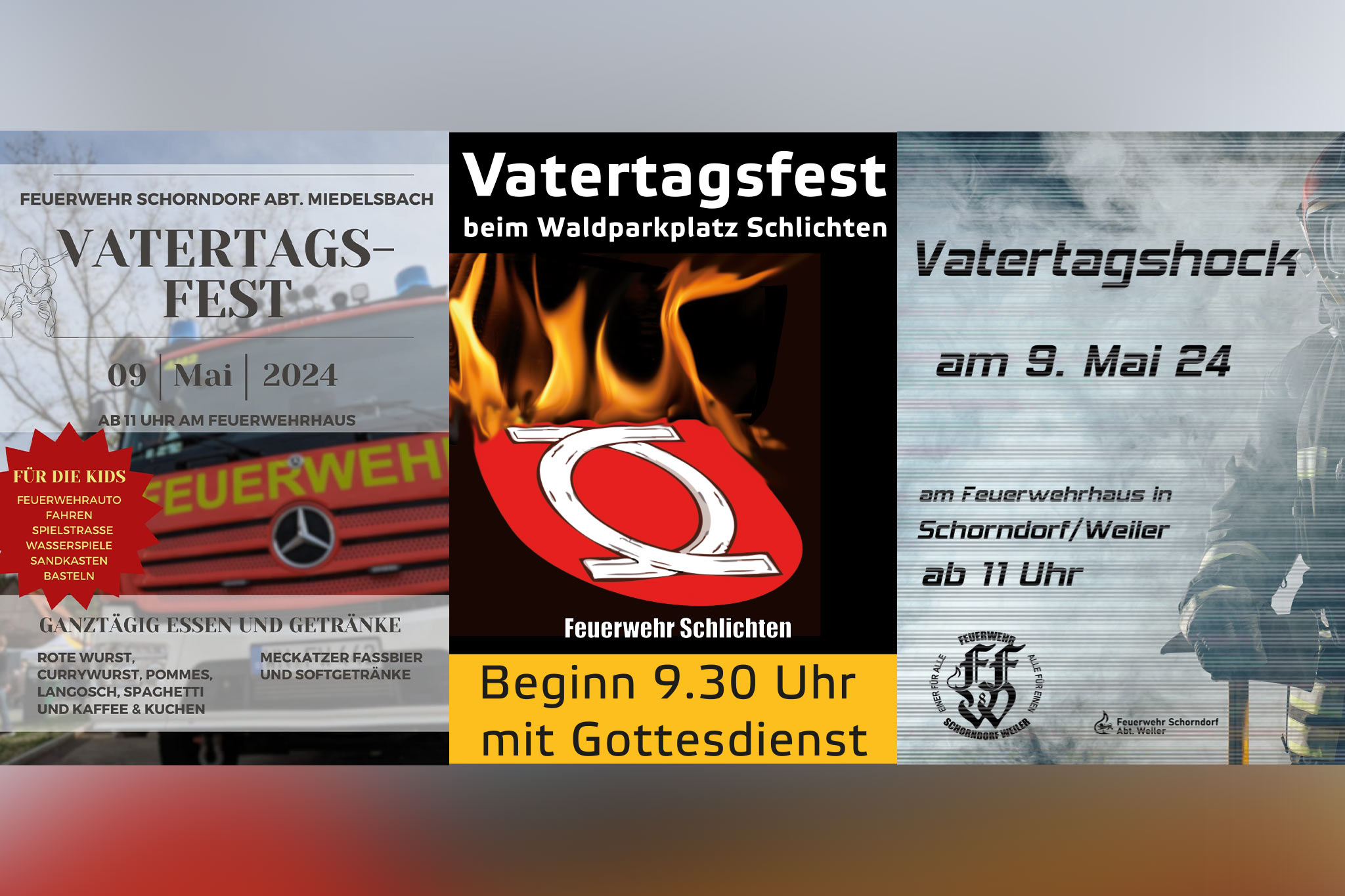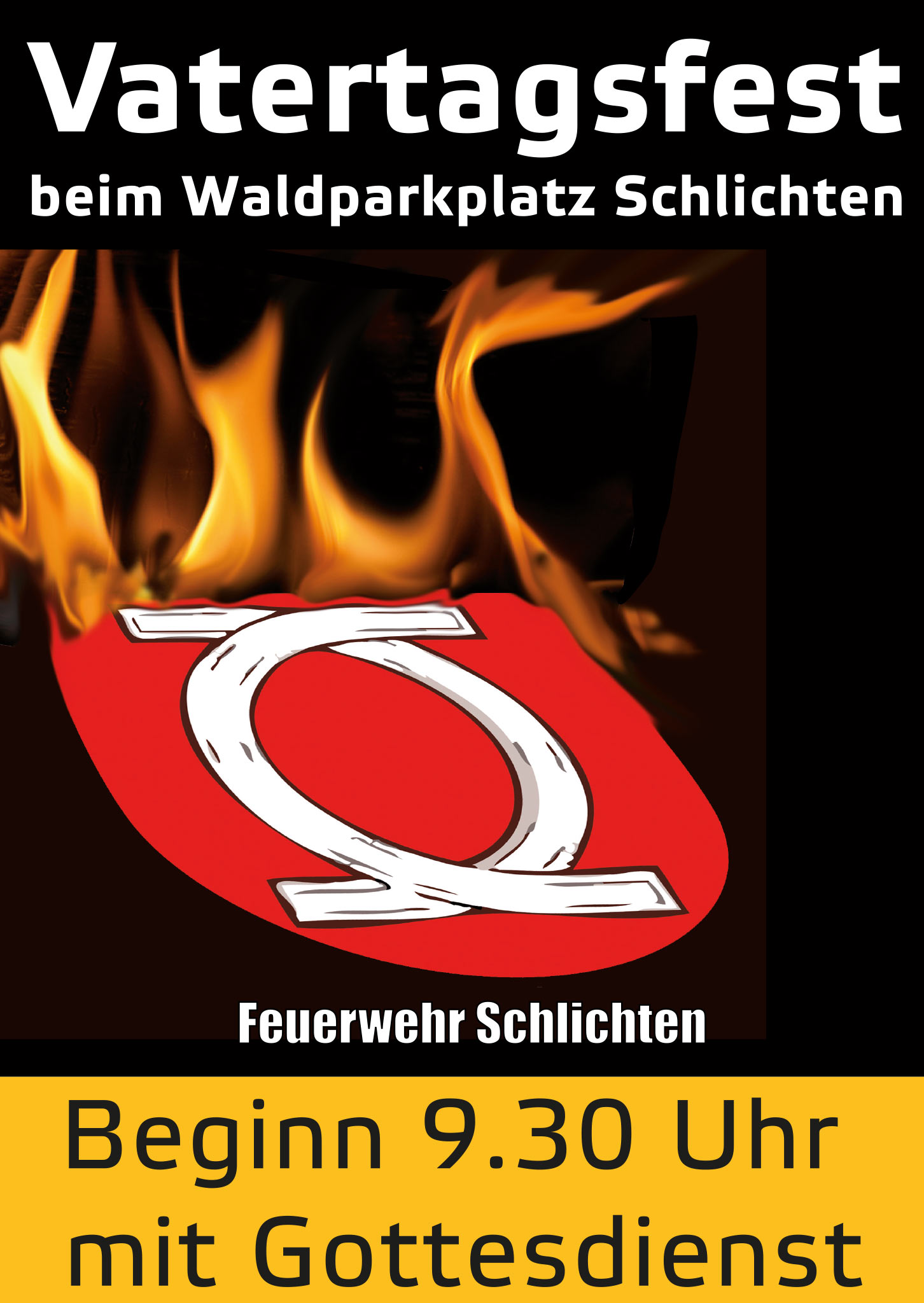 Das Vatertagsfest der Abteilung Schlichten am Waldparkplatz zwischen Schorndorf und Schlichten startet traditionell mit einem Gottestdienst im Grünen mit Pfarrer i.R. und Notfallseelsorger Probst. Umrahmt wird der Gottesdienst vom Posaunenchor Oberberken, bevor das Fest im Anschluss startet. Die Feuerwehrabteilung bietet wieder beste Speisen und Getränke mit selbstgemachtem Kartoffelsalat, Kaffee und Kuchen und vielem mehr.