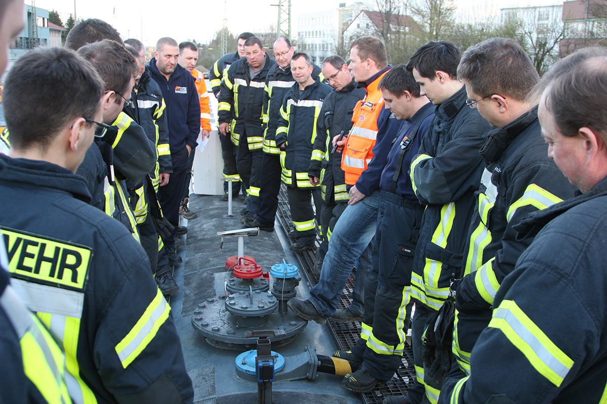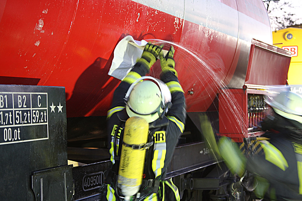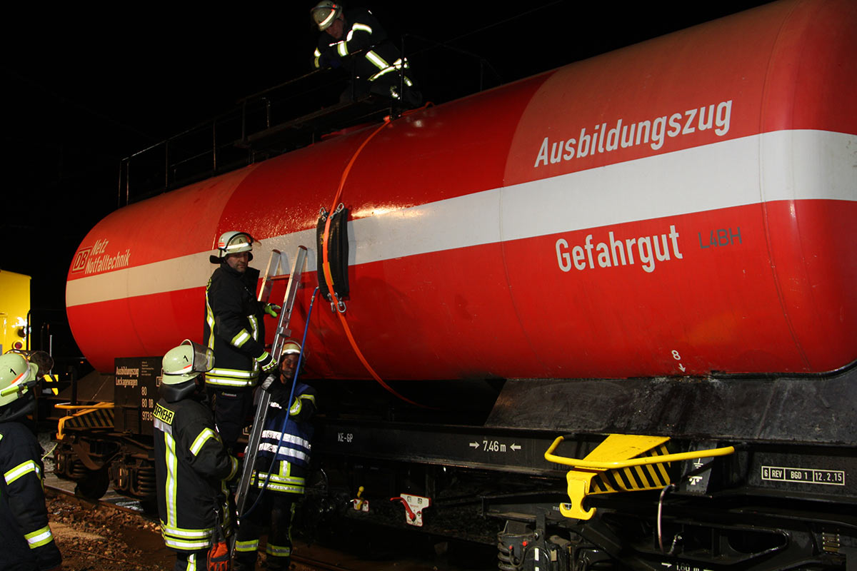 Als noch anspruchsvoller stellten sich aber die praktischen Übungen dar. Der Kesselwagen des Übungskesselwagens kann neun verschiedene Leckagen, Löcher und Risse simulieren. Die Aufgabe der jeweiligen Gruppe bestand darin, die Ausbreitung des auslaufenden Stoffes einzudämmen und nach Möglichkeit die Leckage abzudichten. Nahezu die komplette Beladung des neuen Rüstwagens konnte hier eingesetzt und der praktische Umgang an reellen Einsatzstellen vertieft werden. Manchmal genügte aber auch schon ein im Gleisbett liegender Holzpflock, um ein Loch vollständig zu verschließen. Ein anderer Riss war wiederum so komplex, dass selbst die ausgefeilteste Konstruktion ein weiteres Auslaufen nicht verhindern konnte. Da bleibt dann nur das konsequente Auffangen des auslaufenden Stoffes.
