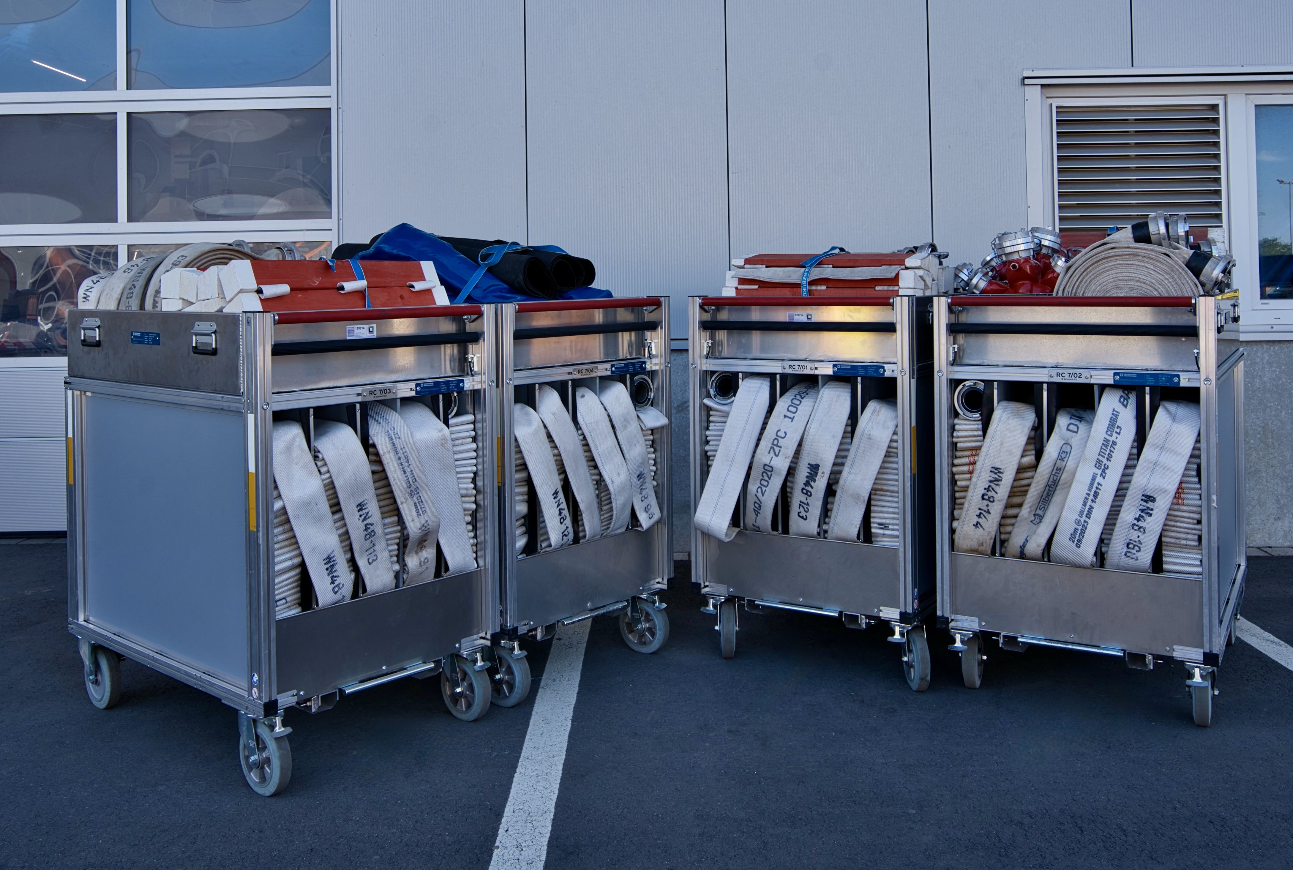 - Für schnelle Wasserförderung über lange Strecken enthalten die Rollwagen RC 7/01 bis RC 7/04 jeweils 500 Meter B-Schlauch in Buchten, verlegbar während der Fahrt.